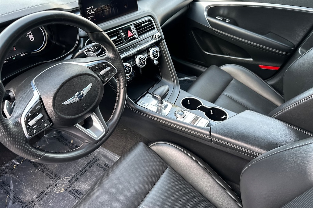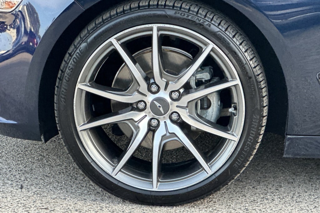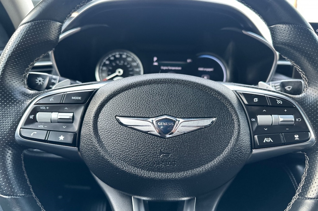 Option Group 01, 4-Wheel Disc Brakes, 6 Speakers, ABS brakes, Air Conditioning, Alloy wheels, AM/FM radio: SiriusXM, Android Auto & Apple CarPlay, Anti-whiplash front head restraints, Auto High-beam Headlights, Auto-dimming Rear-View mirror, Automatic temperature control, Brake assist, Bumpers: body-color, Delay-off headlights, Driver door bin, Driver vanity mirror, Dual front impact airbags, Dual front side impact airbags, Electronic Stability Control, Emergency communication system: Genesis Connected Services, Exterior Parking Camera Rear, Four wheel independent suspension, Front anti-roll bar, Front Bucket Seats, Front Center Armrest, Front dual zone A/C, Front reading lights, Fully automatic headlights, Garage door transmitter: HomeLink, Heated door mirrors, Heated front seats, Heated Multi-Adjustable Front Bucket Seats, Illuminated entry, Knee airbag, Leatherette Seating Surfaces, Low tire pressure warning, Navigation System, Occupant sensing airbag, Outside temperature display, Overhead airbag, Overhead console, Panic alarm, Passenger door bin, Passenger vanity mirror, Power door mirrors, Power driver seat, Power passenger seat, Power steering, Power windows, Radio: AM/FM/SiriusXM/HD Audio System, Rear anti-roll bar, Rear reading lights, Rear seat center armrest, Rear window defroster, Remote keyless entry, Security system, Speed control, Speed-Sensitive Wipers, Split folding rear seat, Steering wheel mounted audio controls, Tachometer, Telescoping steering wheel, Traction control, Trip computer, Turn signal indicator mirrors, Variably intermittent wipers, and Wheels: 19" x 8.0J Fr & 19" x 8.5J Rr Alloy.