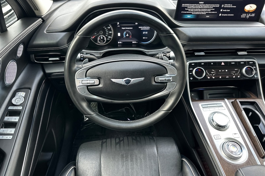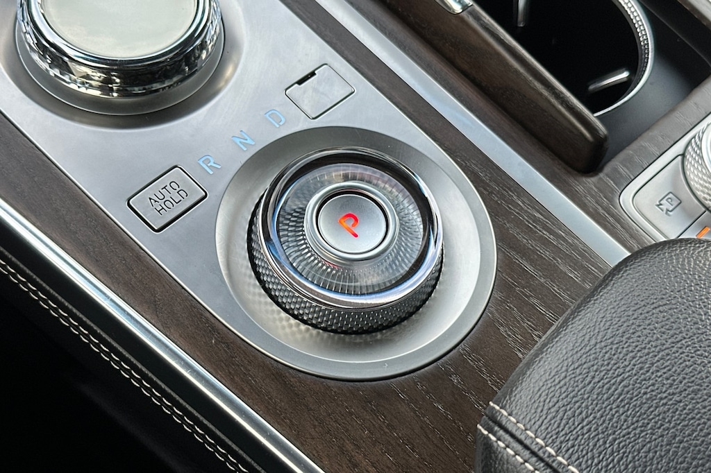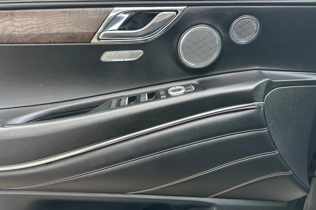 Android Auto & Apple CarPlay, Auto tilt-away steering wheel, Auto-dimming door mirrors, Bumpers: body-color, Front dual zone A/C, Heated steering wheel, Navigation System. Android Auto & Apple CarPlay, Auto tilt-away steering wheel, Auto-dimming door mirrors, Bumpers: body-color, Front dual zone A/C, Heated steering wheel, Navigation System, 21 Speakers, 3.909 Axle Ratio, 3rd row seats: split-bench, 4-Wheel Disc Brakes, ABS brakes, Adaptive suspension, Air Conditioning, Alloy wheels, AM/FM radio: SiriusXM, Anti-whiplash front head restraints, Auto High-beam Headlights, Auto-dimming Rear-View mirror, Automatic temperature control, Brake assist, Compass, Delay-off headlights, Driver door bin, Driver vanity mirror, Dual front impact airbags, Dual front side impact airbags, Electronic Stability Control, Emergency communication system: Genesis Connected Services, Exterior Parking Camera Rear, Four wheel independent suspension, Front anti-roll bar, Front Bucket Seats, Front Center Armrest, Front reading lights, Fully automatic headlights, Garage door transmitter: HomeLink, Genuine wood console insert, Genuine wood dashboard insert, Genuine wood door panel insert, Heads-Up Display, Heated & Ventilated Front Bucket Seats, Heated door mirrors, Heated front seats, Heated rear seats, Illuminated entry, Knee airbag, Leather Seating Surfaces, Leather steering wheel, Low tire pressure warning, Memory seat, Occupant sensing airbag, Outside temperature display, Overhead airbag, Overhead console, Panic alarm, Passenger door bin, Passenger vanity mirror, Power door mirrors, Power driver seat, Power Liftgate, Power moonroof, Power passenger seat, Power steering, Power windows, Premium audio system: Lexicon, Radio data system, Radio: AM/FM/SiriusXM/HD Lexicon Prem Audio System, Rain sensing wipers, Rear air conditioning, Rear anti-roll bar, Rear reading lights, Rear seat center armrest, Rear side impact airbag, Rear window defroster, Rear window wiper, Reclining 3rd row seat, Remote keyless entry, Security system, Speed control, Speed-sensing steering, Speed-Sensitive Wipers, Split folding rear seat, Spoiler, Steering wheel memory, Steering wheel mounted audio controls, Tachometer, Telescoping steering wheel, Tilt steering wheel, Traction control, Trip computer, Turn signal indicator mirrors, Variably intermittent wipers, Ventilated front seats, and Wheels: 20" x 8.5J Medium Metallic Gray Alloy.
