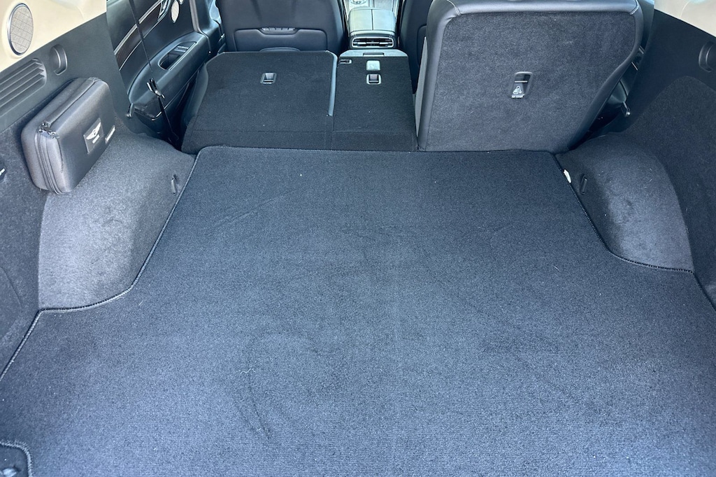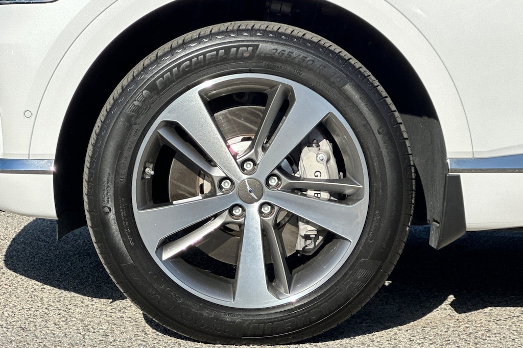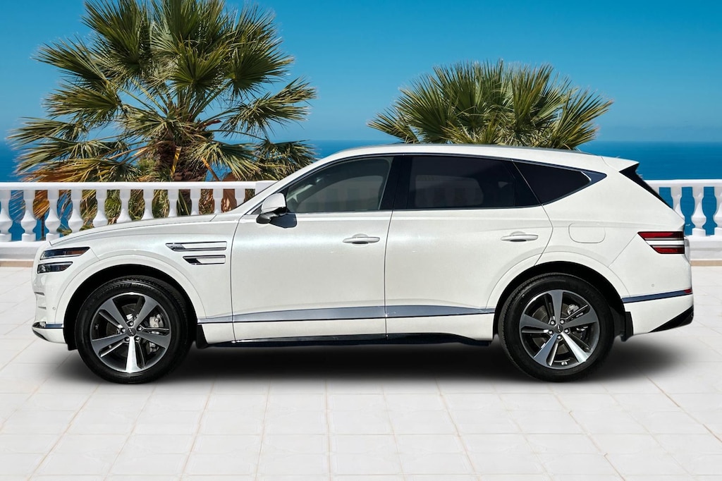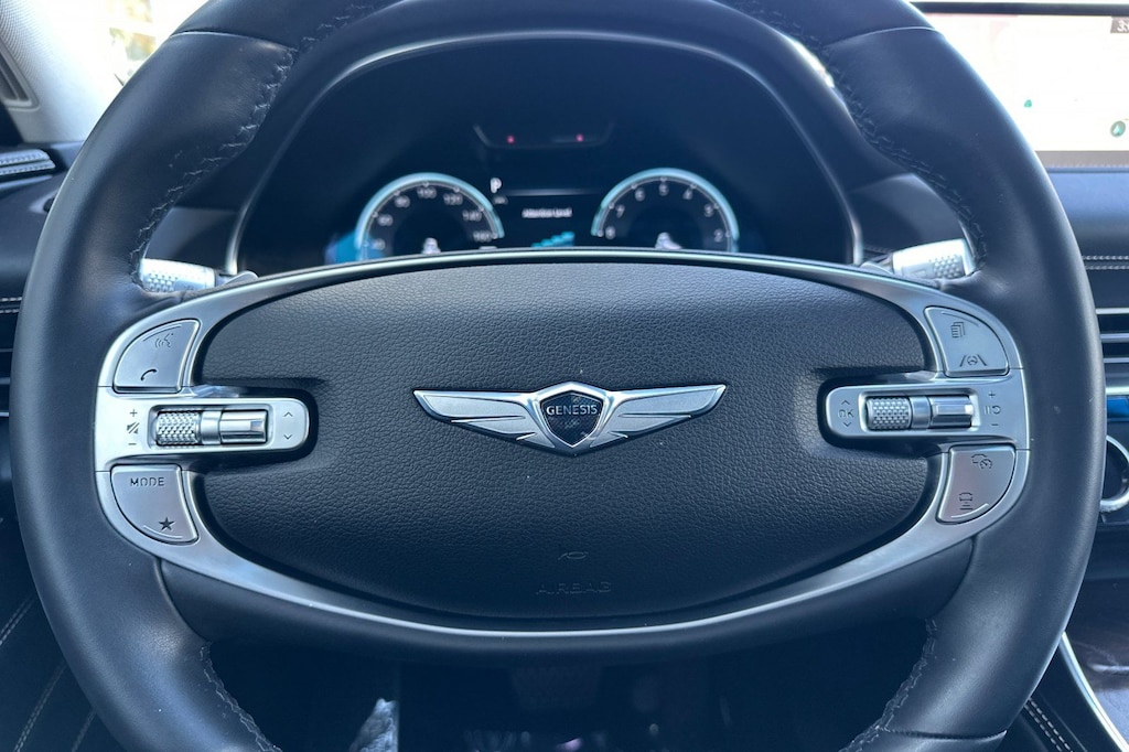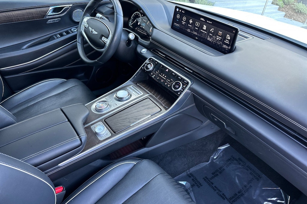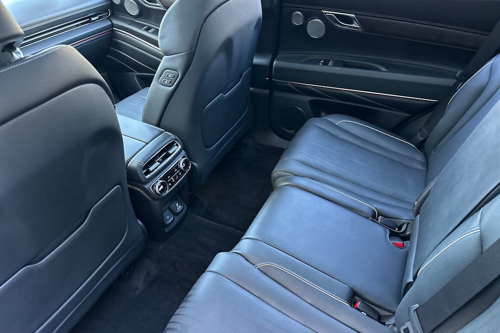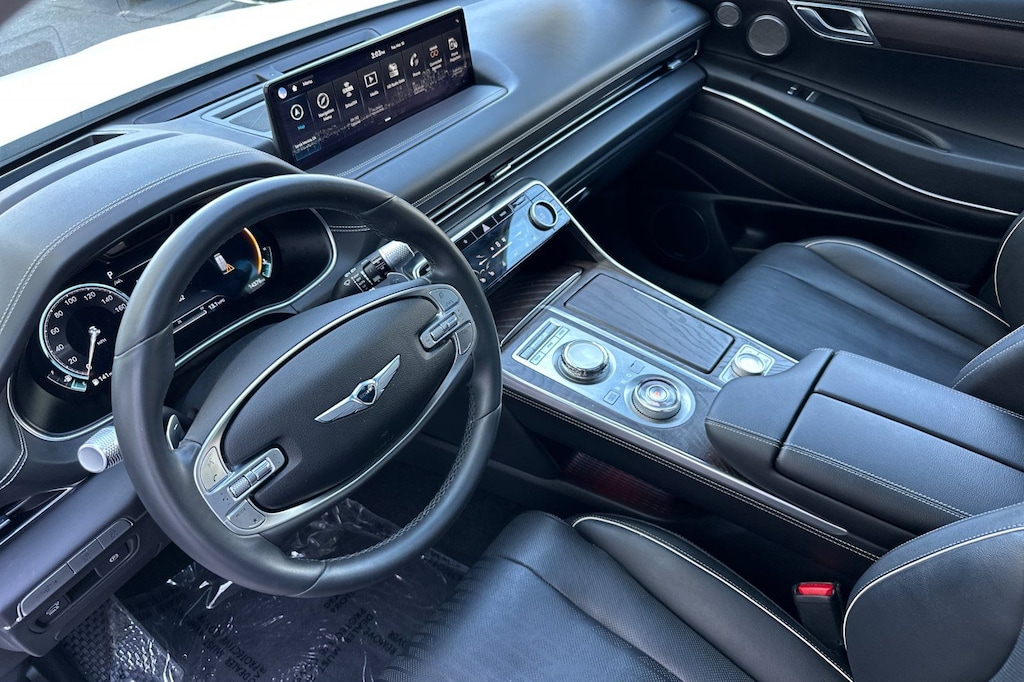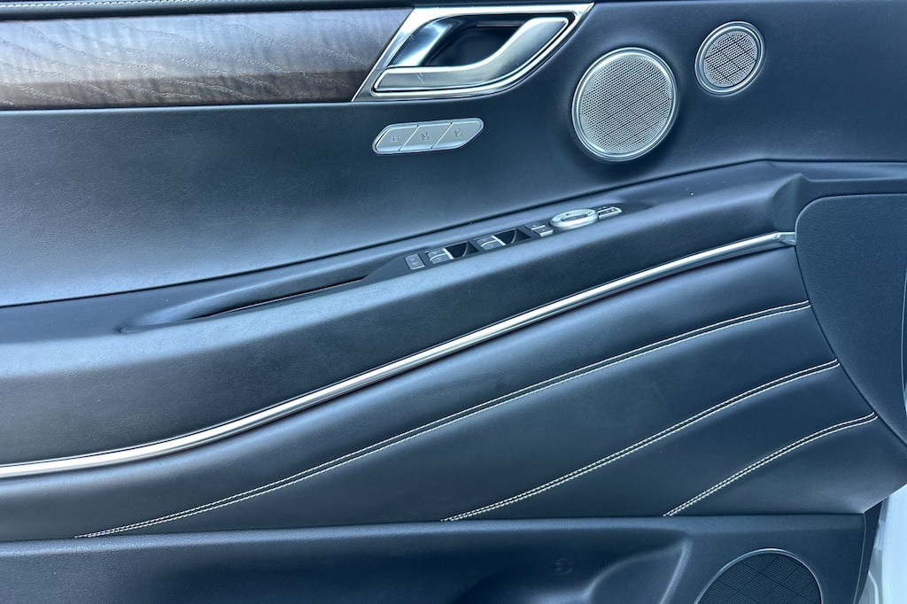 Advanced Package, Android Auto & Apple CarPlay, Navigation System, Option Group 02, Prestige 20" Package. Advanced Package (Option Group 02), Prestige 20" Package, Android Auto & Apple CarPlay, Navigation System, 12 Speakers, 4-Wheel Disc Brakes, 4.363 Axle Ratio, ABS brakes, Air Conditioning, Alloy wheels, AM/FM radio: SiriusXM, Anti-whiplash front head restraints, Auto High-beam Headlights, Auto tilt-away steering wheel, Auto-dimming door mirrors, Auto-dimming Rear-View mirror, Auto-leveling suspension, Automatic temperature control, Brake assist, Bumpers: body-color, Compass, Delay-off headlights, Driver door bin, Driver vanity mirror, Dual front impact airbags, Dual front side impact airbags, Electronic Stability Control, Emergency communication system: Genesis Connected Services, Exterior Parking Camera Rear, Four wheel independent suspension, Front anti-roll bar, Front Bucket Seats, Front Center Armrest, Front dual zone A/C, Front reading lights, Fully automatic headlights, Garage door transmitter: HomeLink, Genuine wood console insert, Genuine wood dashboard insert, Genuine wood door panel insert, Heated door mirrors, Heated Front Bucket Seats, Heated front seats, Heated steering wheel, Illuminated entry, Knee airbag, Leather steering wheel, Leatherette Seating Surfaces, Low tire pressure warning, Memory seat, Occupant sensing airbag, Outside temperature display, Overhead airbag, Overhead console, Panic alarm, Passenger door bin, Passenger vanity mirror, Power door mirrors, Power driver seat, Power Liftgate, Power passenger seat, Power steering, Power windows, Radio data system, Radio: AM/FM/SiriusXM/HD Audio System, Rain sensing wipers, Rear air conditioning, Rear anti-roll bar, Rear reading lights, Rear seat center armrest, Rear side impact airbag, Rear window defroster, Rear window wiper, Remote keyless entry, Security system, Speed control, Speed-sensing steering, Speed-Sensitive Wipers, Split folding rear seat, Spoiler, Steering wheel memory, Steering wheel mounted audio controls, Tachometer, Telescoping steering wheel, Tilt steering wheel, Traction control, Trip computer, Turn signal indicator mirrors, Variably intermittent wipers, and Wheels: 19" x 8.5J Medium Metallic Gray Alloy.