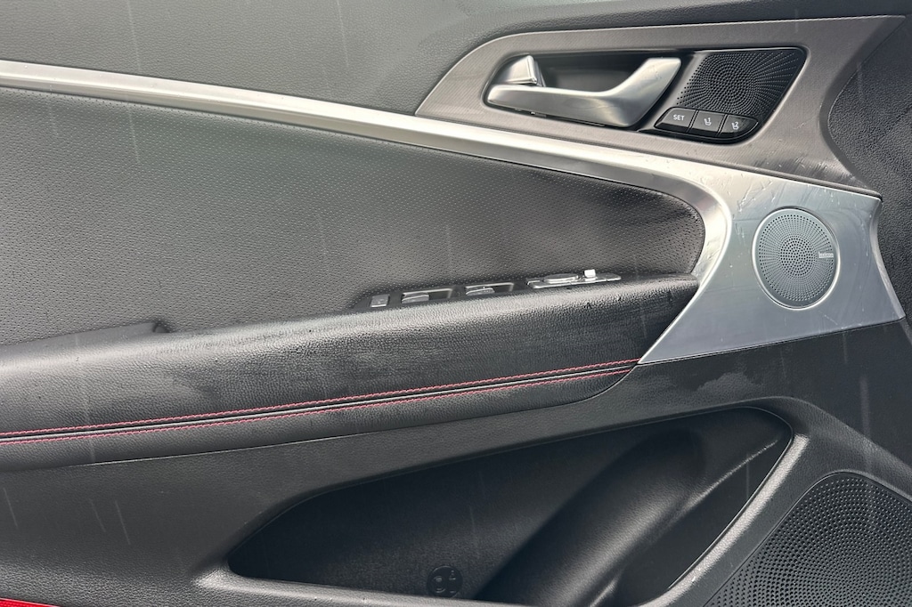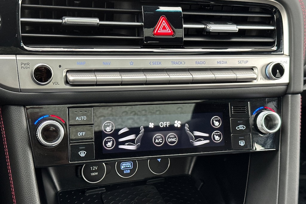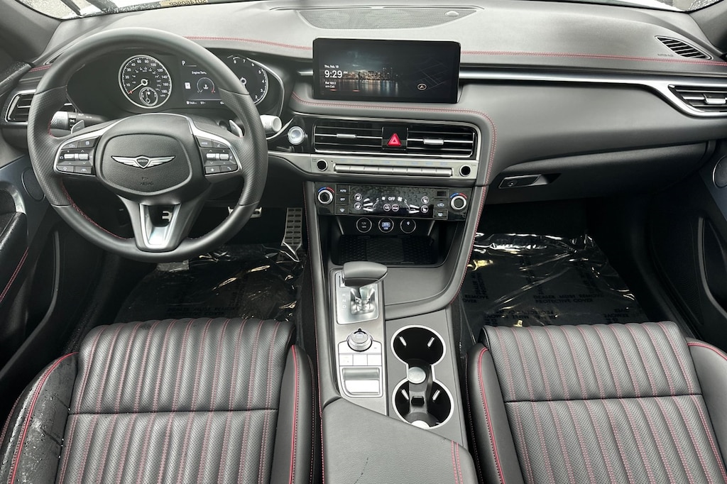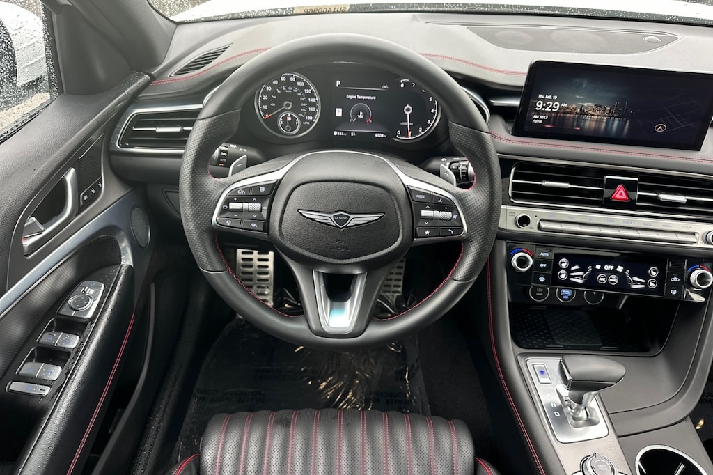 15 Speakers, 4-Wheel Disc Brakes, ABS brakes, Air Conditioning, Alloy wheels, AM/FM radio: SiriusXM, Android Auto & Apple CarPlay, Anti-whiplash front head restraints, Auto High-beam Headlights, Auto-dimming door mirrors, Auto-dimming Rear-View mirror, Automatic temperature control, Brake assist, Bumpers: body-color, Delay-off headlights, Driver door bin, Driver vanity mirror, Dual front impact airbags, Dual front side impact airbags, Electronic Stability Control, Emergency communication system: Genesis Connected Services, Exterior Parking Camera Rear, Four wheel independent suspension, Front anti-roll bar, Front Bucket Seats, Front Center Armrest, Front dual zone A/C, Front reading lights, Fully automatic headlights, Garage door transmitter: HomeLink, Heated door mirrors, Heated front seats, Htd & Ventilated Multi-Adjustable Fr Bucket Seats, Illuminated entry, Knee airbag, Leather Seating Surfaces, Leather steering wheel, Low tire pressure warning, Memory seat, Navigation System, Occupant sensing airbag, Outside temperature display, Overhead airbag, Overhead console, Panic alarm, Passenger door bin, Passenger vanity mirror, Power door mirrors, Power driver seat, Power moonroof, Power passenger seat, Power steering, Power windows, Radio: AM/FM/SiriusXM/HD Lexicon Prem Audio System, Rain sensing wipers, Rear anti-roll bar, Rear reading lights, Rear seat center armrest, Rear side impact airbag, Rear window defroster, Remote keyless entry, Security system, Speed control, Speed-sensing steering, Speed-Sensitive Wipers, Split folding rear seat, Steering wheel memory, Steering wheel mounted audio controls, Tachometer, Telescoping steering wheel, Traction control, Trip computer, Turn signal indicator mirrors, Variably intermittent wipers, Ventilated front seats, and Wheels: 19" x 8.0J Fr & 19" x 8.5J Rr Sport Alloy.