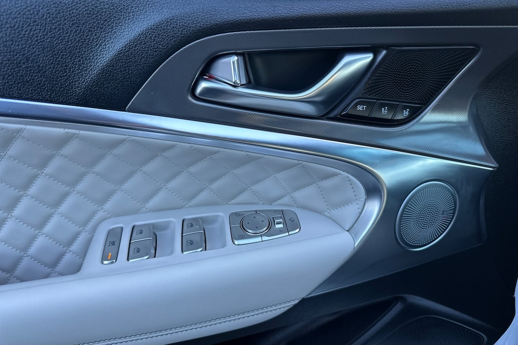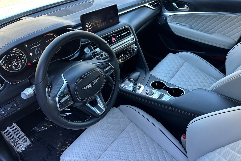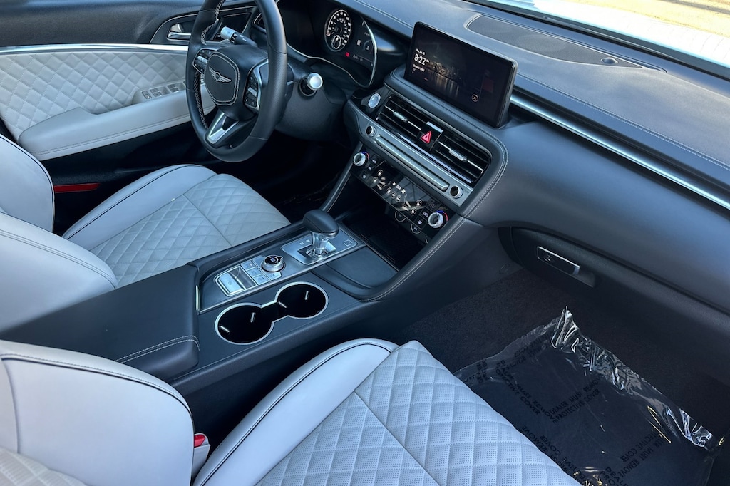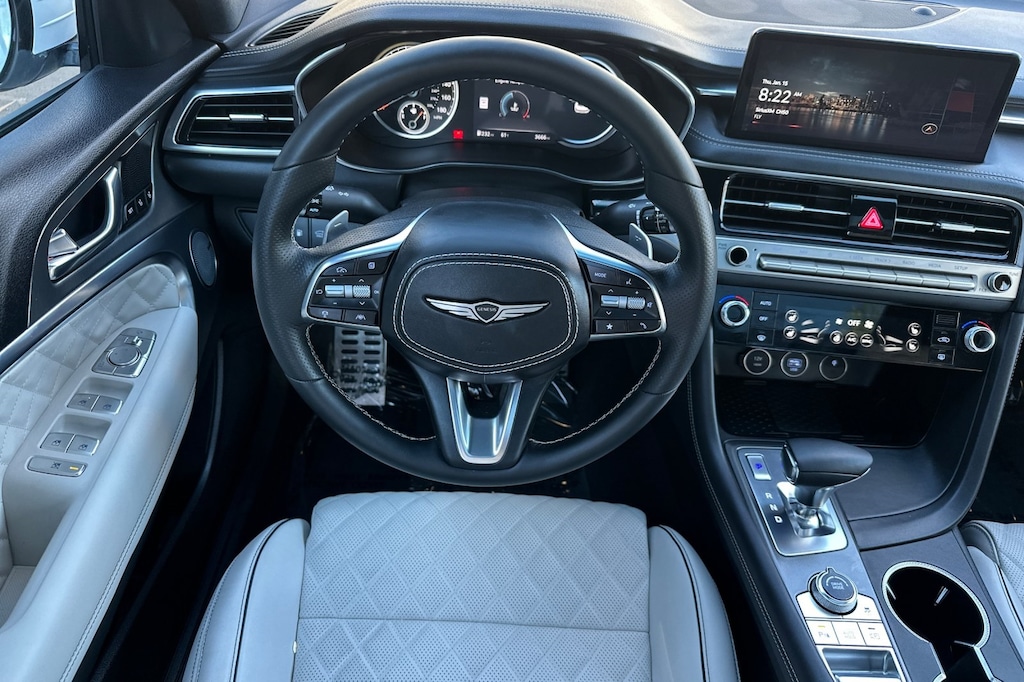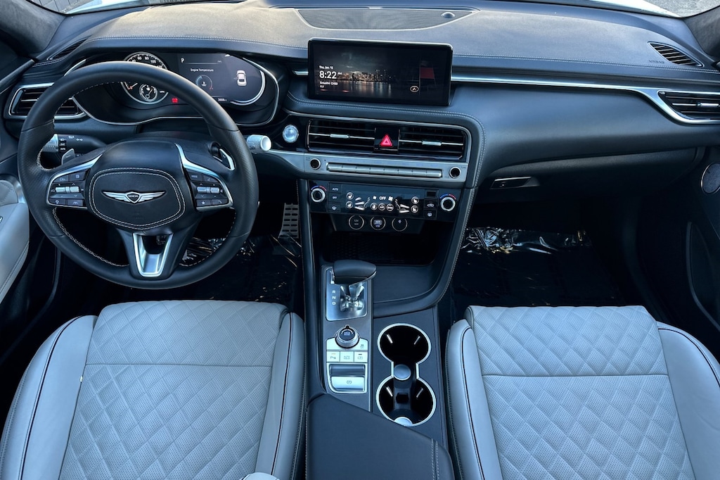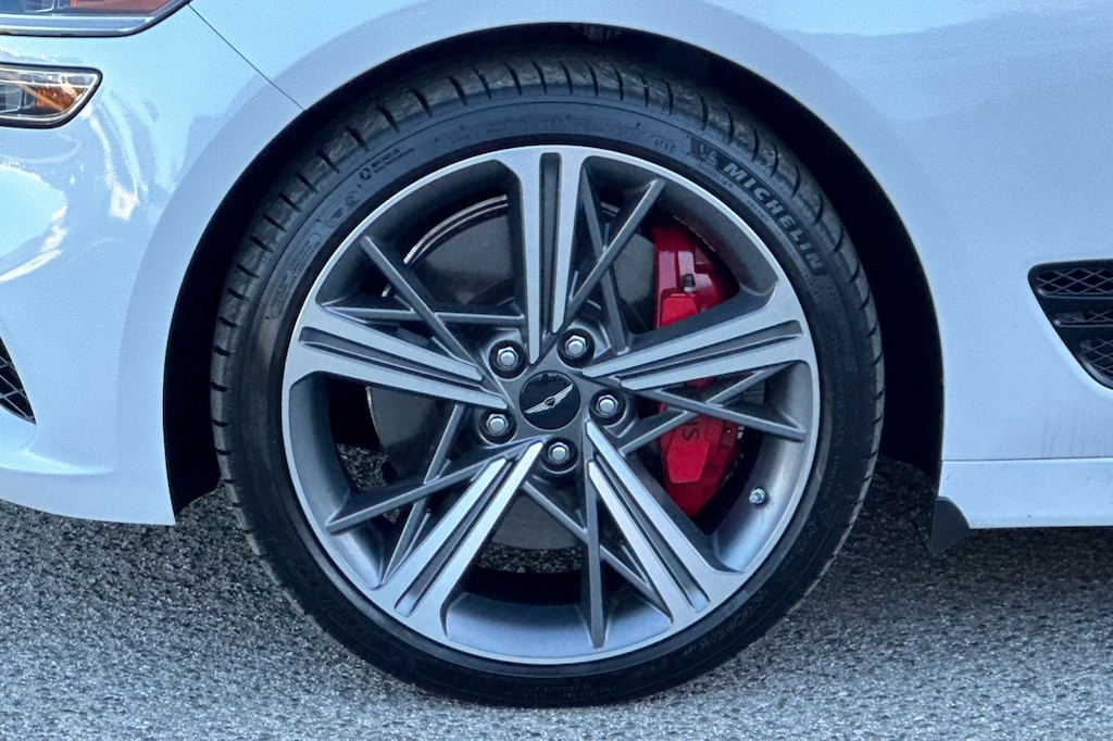 Sport Prestige Package, 15 Speakers, 4-Wheel Disc Brakes, ABS brakes, Air Conditioning, Alloy wheels, AM/FM radio: SiriusXM, Android Auto & Apple CarPlay, Anti-whiplash front head restraints, Auto High-beam Headlights, Auto-dimming door mirrors, Auto-dimming Rear-View mirror, Automatic temperature control, Brake assist, Bumper Applique, Bumpers: body-color, Delay-off headlights, Driver door bin, Driver vanity mirror, Dual front impact airbags, Dual front side impact airbags, Electronic Stability Control, Emergency communication system: Genesis Connected Services, Exterior Parking Camera Rear, First Aid Kit, Four wheel independent suspension, Front anti-roll bar, Front Bucket Seats, Front Center Armrest, Front dual zone A/C, Front reading lights, Fully automatic headlights, Garage door transmitter: HomeLink, Heated door mirrors, Heated front seats, Htd & Ventilated Multi-Adjustable Fr Bucket Seats, Illuminated Door Scuff Plates, Illuminated entry, Knee airbag, Leather Seating Surfaces, Leather steering wheel, Low tire pressure warning, Memory seat, Navigation System, Occupant sensing airbag, Outside temperature display, Overhead airbag, Overhead console, Panic alarm, Passenger door bin, Passenger vanity mirror, Power door mirrors, Power driver seat, Power moonroof, Power passenger seat, Power steering, Power windows, Radio: AM/FM/SiriusXM/HD Lexicon Prem Audio System, Rain sensing wipers, Rear anti-roll bar, Rear reading lights, Rear seat center armrest, Rear side impact airbag, Rear window defroster, Remote keyless entry, Reversible Cargo Tray, Security system, Speed control, Speed-sensing steering, Speed-Sensitive Wipers, Split folding rear seat, Steering wheel memory, Steering wheel mounted audio controls, Tachometer, Telescoping steering wheel, Traction control, Trip computer, Turn signal indicator mirrors, Variably intermittent wipers, Ventilated front seats, and Wheels: 19" x 8.0J Fr & 19" x 8.5J Rr Sport Alloy.