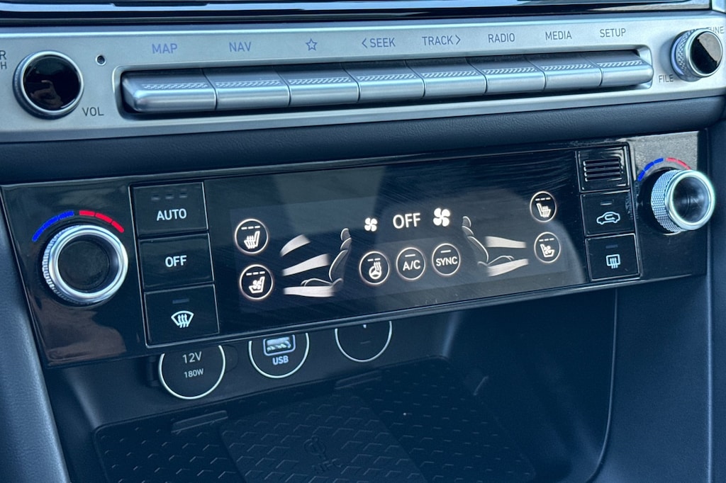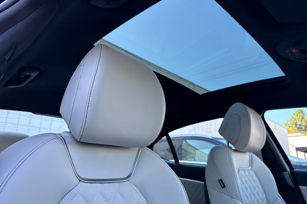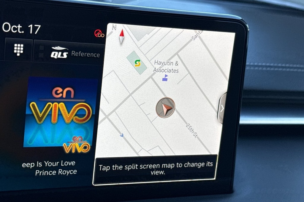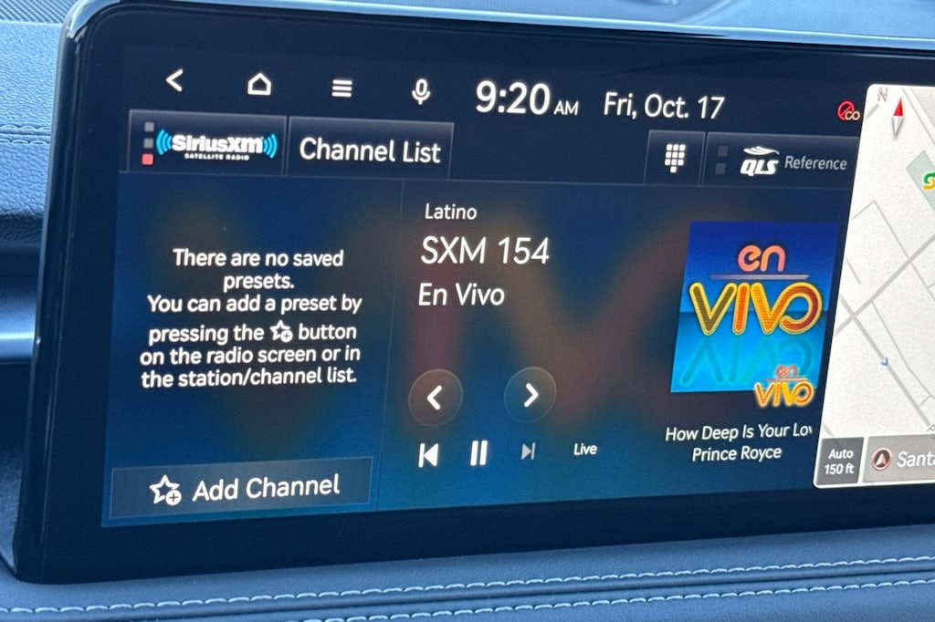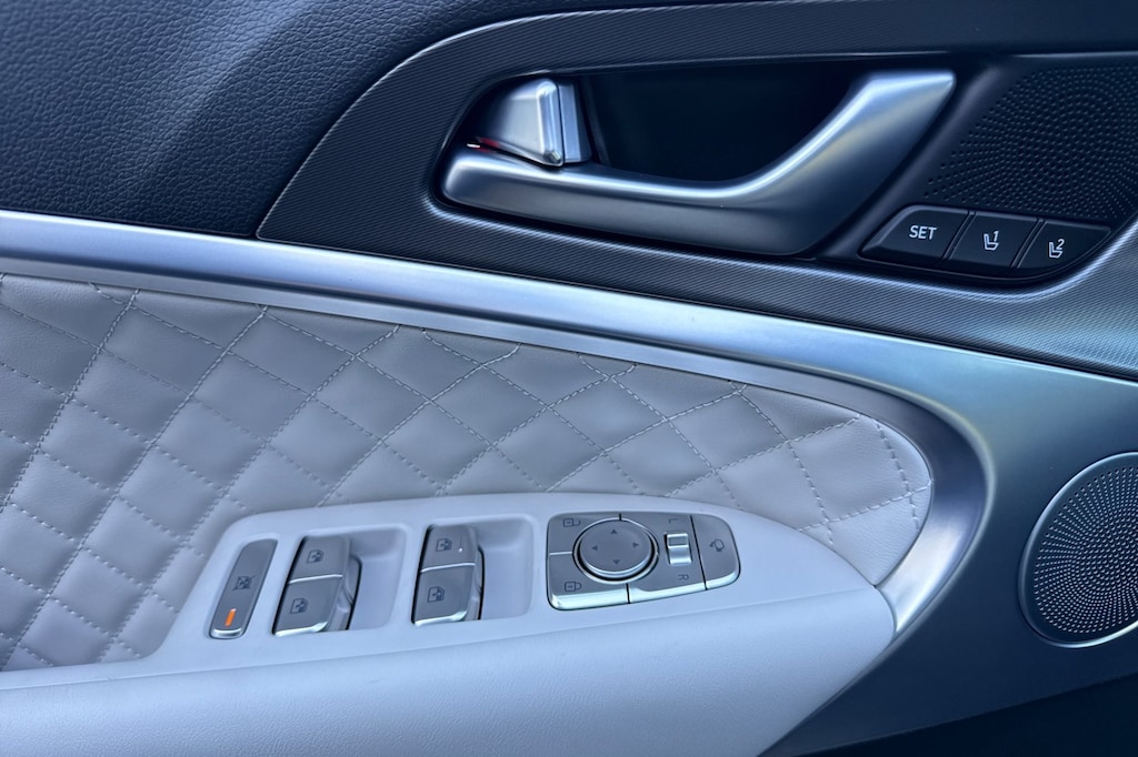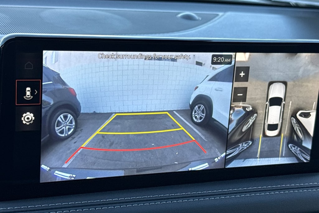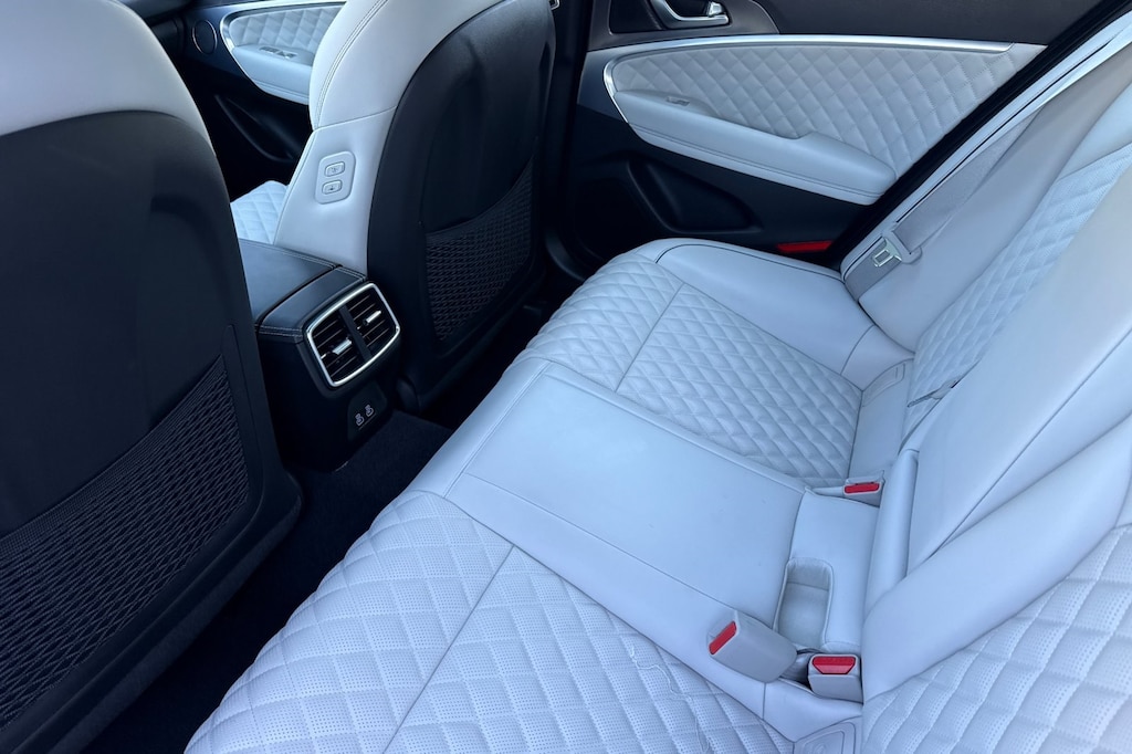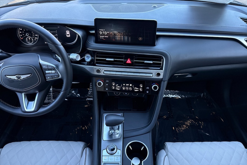 Navigation System, Option Group 04, Sport Prestige Package. Sport Prestige Package (Option Group 04), Navigation System, 15 Speakers, 4-Wheel Disc Brakes, ABS brakes, Air Conditioning, Alloy wheels, AM/FM radio: SiriusXM, Android Auto & Apple CarPlay, Anti-whiplash front head restraints, Auto High-beam Headlights, Auto-dimming door mirrors, Auto-dimming Rear-View mirror, Automatic temperature control, Brake assist, Bumpers: body-color, Delay-off headlights, Driver door bin, Driver vanity mirror, Dual front impact airbags, Dual front side impact airbags, Electronic Stability Control, Emergency communication system: Genesis Connected Services, Exterior Parking Camera Rear, First Aid Kit, Four wheel independent suspension, Front anti-roll bar, Front Bucket Seats, Front Center Armrest, Front dual zone A/C, Front reading lights, Fully automatic headlights, Garage door transmitter: HomeLink, Heated door mirrors, Heated front seats, Htd & Ventilated Multi-Adjustable Fr Bucket Seats, Illuminated Door Scuff Plates, Illuminated entry, Knee airbag, Leather Seating Surfaces, Low tire pressure warning, Memory seat, Occupant sensing airbag, Outside temperature display, Overhead airbag, Overhead console, Panic alarm, Passenger door bin, Passenger vanity mirror, Power door mirrors, Power driver seat, Power moonroof, Power passenger seat, Power steering, Power windows, Radio: AM/FM/SiriusXM/HD Lexicon Prem Audio System, Rain sensing wipers, Rear anti-roll bar, Rear reading lights, Rear seat center armrest, Rear side impact airbag, Rear window defroster, Remote keyless entry, Security system, Speed control, Speed-sensing steering, Speed-Sensitive Wipers, Split folding rear seat, Steering wheel memory, Steering wheel mounted audio controls, Tachometer, Telescoping steering wheel, Traction control, Trip computer, Turn signal indicator mirrors, Variably intermittent wipers, Ventilated front seats, and Wheels: 19" x 8.0J Fr & 19" x 8.5J Rr Sport Alloy.