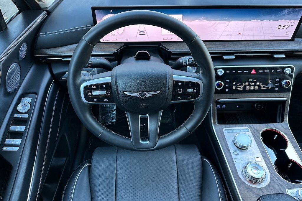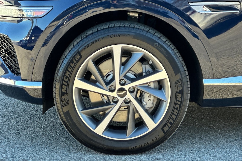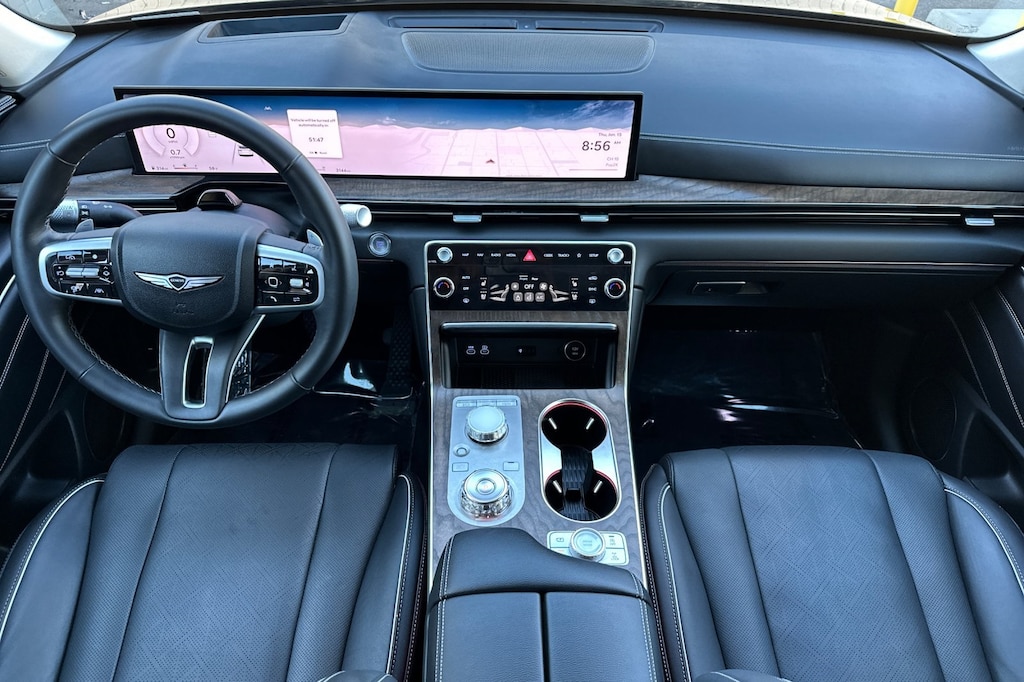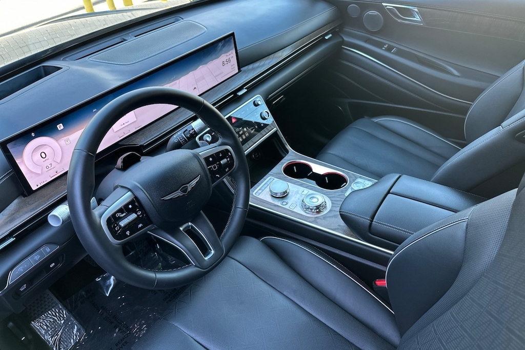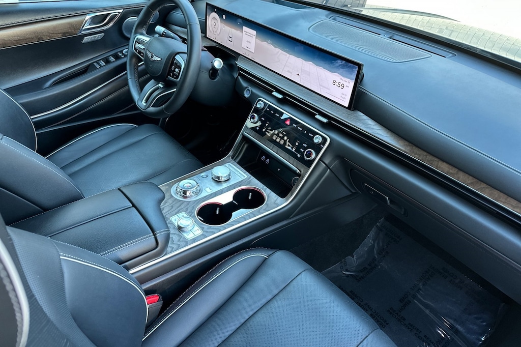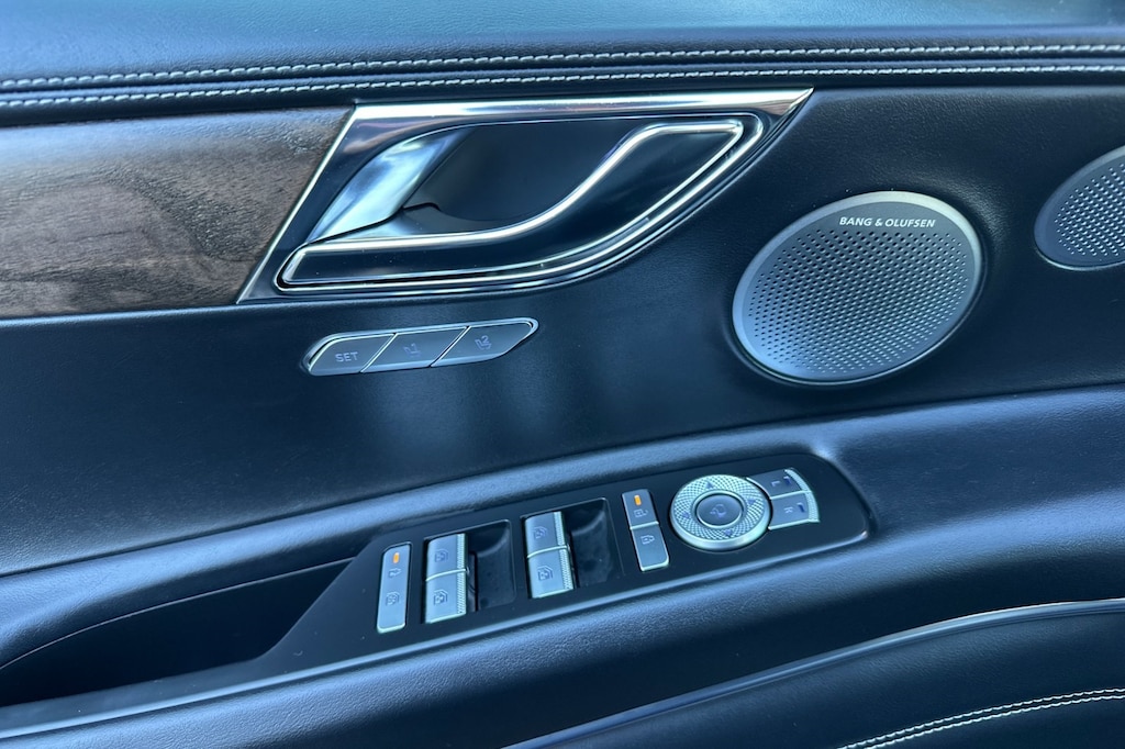 Option Group 01, 18 Speakers, 3rd row seats: split-bench, 4-Wheel Disc Brakes, ABS brakes, Adaptive suspension, Air Conditioning, Alloy wheels, AM/FM radio: SiriusXM, Anti-whiplash front head restraints, Auto High-beam Headlights, Auto tilt-away steering wheel, Auto-dimming door mirrors, Auto-dimming Rear-View mirror, Automatic temperature control, Brake assist, Bumpers: body-color, Compass, Delay-off headlights, Driver door bin, Driver vanity mirror, Dual front impact airbags, Dual front side impact airbags, Electronic Stability Control, Emergency communication system: Genesis Connected Services, Exterior Parking Camera Rear, Four wheel independent suspension, Fragrance Cartridge, Front anti-roll bar, Front Bucket Seats, Front Center Armrest, Front dual zone A/C, Front reading lights, Fully automatic headlights, Garage door transmitter: HomeLink, Genuine wood console insert, Genuine wood dashboard insert, Genuine wood door panel insert, Heads-Up Display, Heated & Ventilated Front Bucket Seats, Heated door mirrors, Heated front seats, Heated rear seats, Heated steering wheel, Illuminated entry, Knee airbag, Leather Seating Surfaces, Leather steering wheel, Low tire pressure warning, Memory seat, Navigation System, NFC Key Card, Occupant sensing airbag, Outside temperature display, Overhead airbag, Overhead console, Panic alarm, Passenger door bin, Passenger vanity mirror, Power door mirrors, Power driver seat, Power Liftgate, Power moonroof, Power passenger seat, Power steering, Power windows, Radio data system, Radio: AM/FM/SiriusXM/HD Bang & Olufsen Sound Sys, Rain sensing wipers, Rear air conditioning, Rear anti-roll bar, Rear reading lights, Rear seat center armrest, Rear side impact airbag, Rear window defroster, Rear window wiper, Reclining 3rd row seat, Remote keyless entry, Security system, Speed control, Speed-sensing steering, Speed-Sensitive Wipers, Split folding rear seat, Spoiler, Steering wheel memory, Steering wheel mounted audio controls, Tachometer, Telescoping steering wheel, Tilt steering wheel, Traction control, Trip computer, Turn signal indicator mirrors, Variably intermittent wipers, Ventilated front seats, Wheel Locks, and Wheels: 20" x 8.5J Dark Gray Matte Alloy.