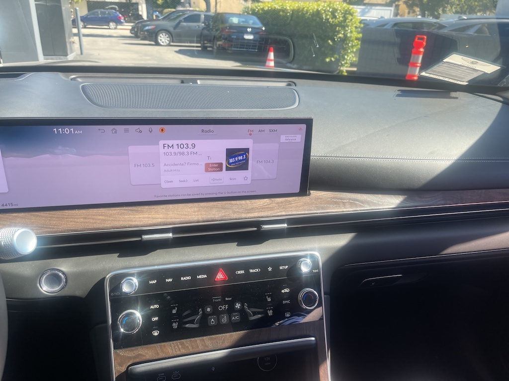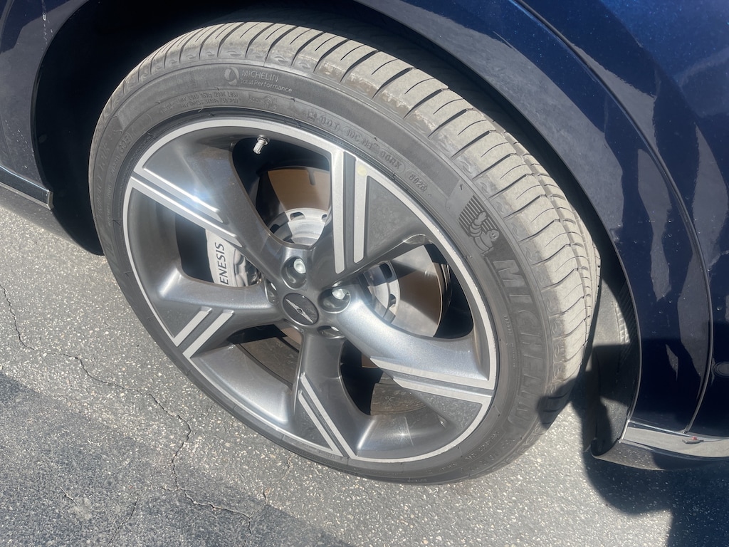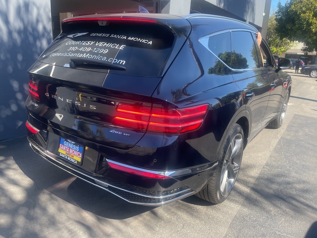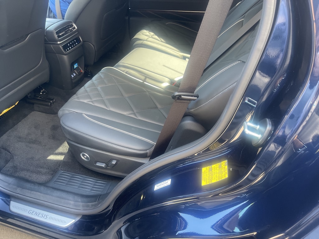 Option Group 01, 18 Speakers, 4-Wheel Disc Brakes, ABS brakes, Adaptive suspension, Air Conditioning, Alloy wheels, AM/FM radio: SiriusXM, Anti-whiplash front head restraints, Auto High-beam Headlights, Auto tilt-away steering wheel, Auto-dimming door mirrors, Auto-dimming Rear-View mirror, Automatic temperature control, Brake assist, Bumpers: body-color, Compass, Delay-off headlights, Driver door bin, Driver vanity mirror, Dual front impact airbags, Dual front side impact airbags, Electronic Stability Control, Emergency communication system: Genesis Connected Services, Exterior Parking Camera Rear, First Aid Kit, Four wheel independent suspension, Front anti-roll bar, Front Bucket Seats, Front Center Armrest, Front dual zone A/C, Front reading lights, Fully automatic headlights, Garage door transmitter: HomeLink, Genuine wood console insert, Genuine wood dashboard insert, Genuine wood door panel insert, Heads-Up Display, Heated & Ventilated Front Bucket Seats, Heated door mirrors, Heated front seats, Heated rear seats, Heated steering wheel, Illuminated entry, Knee airbag, Leather steering wheel, Low tire pressure warning, Memory seat, Nappa Leather Seating Surfaces, Navigation System, NFC Key Card, Occupant sensing airbag, Outside temperature display, Overhead airbag, Overhead console, Panic alarm, Passenger door bin, Passenger vanity mirror, Power door mirrors, Power driver seat, Power Liftgate, Power moonroof, Power passenger seat, Power steering, Power windows, Radio data system, Radio: AM/FM/SiriusXM/HD Bang & Olufsen Sound Sys, Rain sensing wipers, Rear air conditioning, Rear anti-roll bar, Rear reading lights, Rear seat center armrest, Rear side impact airbag, Rear window defroster, Rear window wiper, Remote keyless entry, Security system, Speed control, Speed-sensing steering, Speed-Sensitive Wipers, Split folding rear seat, Spoiler, Steering wheel memory, Steering wheel mounted audio controls, Tachometer, Telescoping steering wheel, Tilt steering wheel, Traction control, Trip computer, Turn signal indicator mirrors, Variably intermittent wipers, Ventilated front seats, Ventilated rear seats, and Wheels: 22" x 9.5J Dark Gray Matte Alloy.