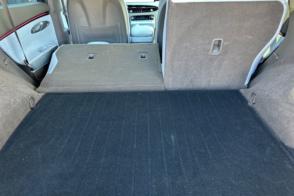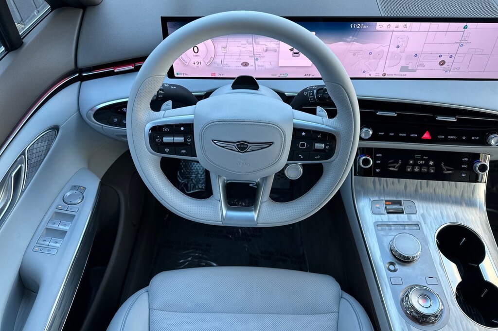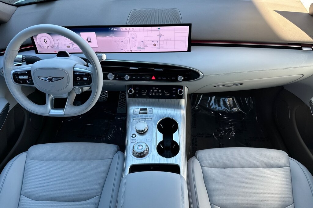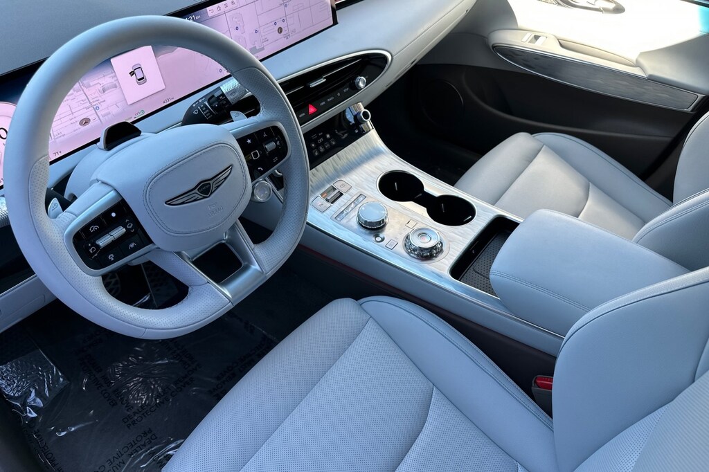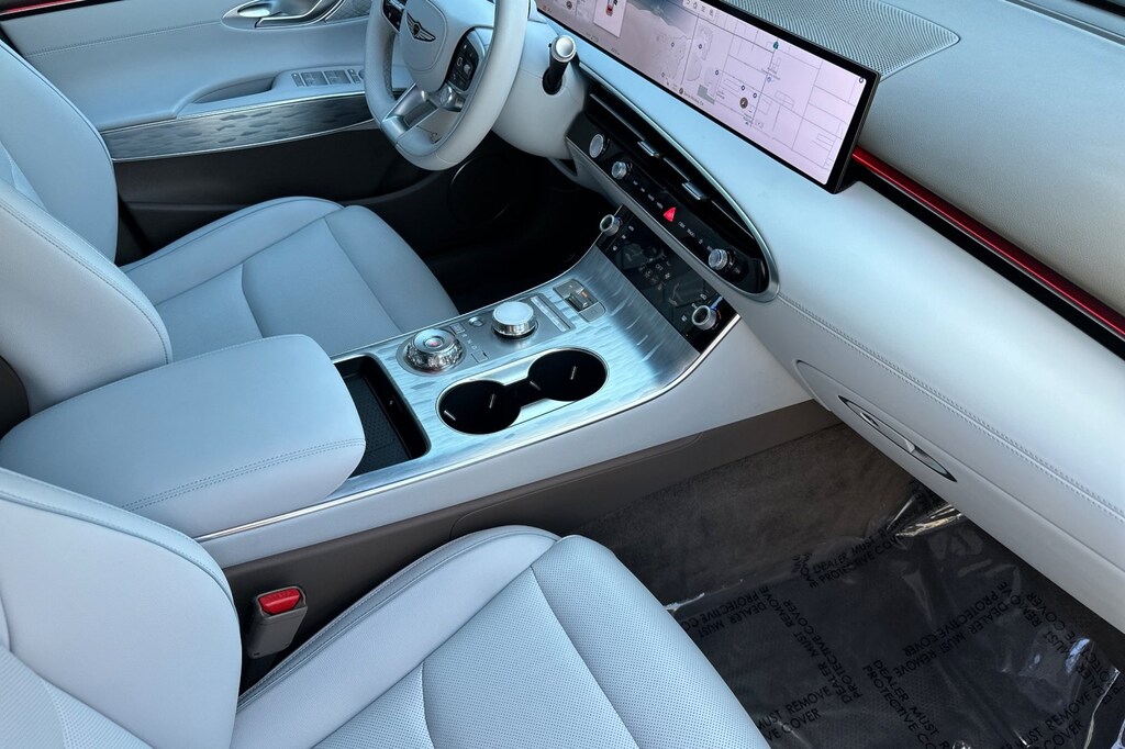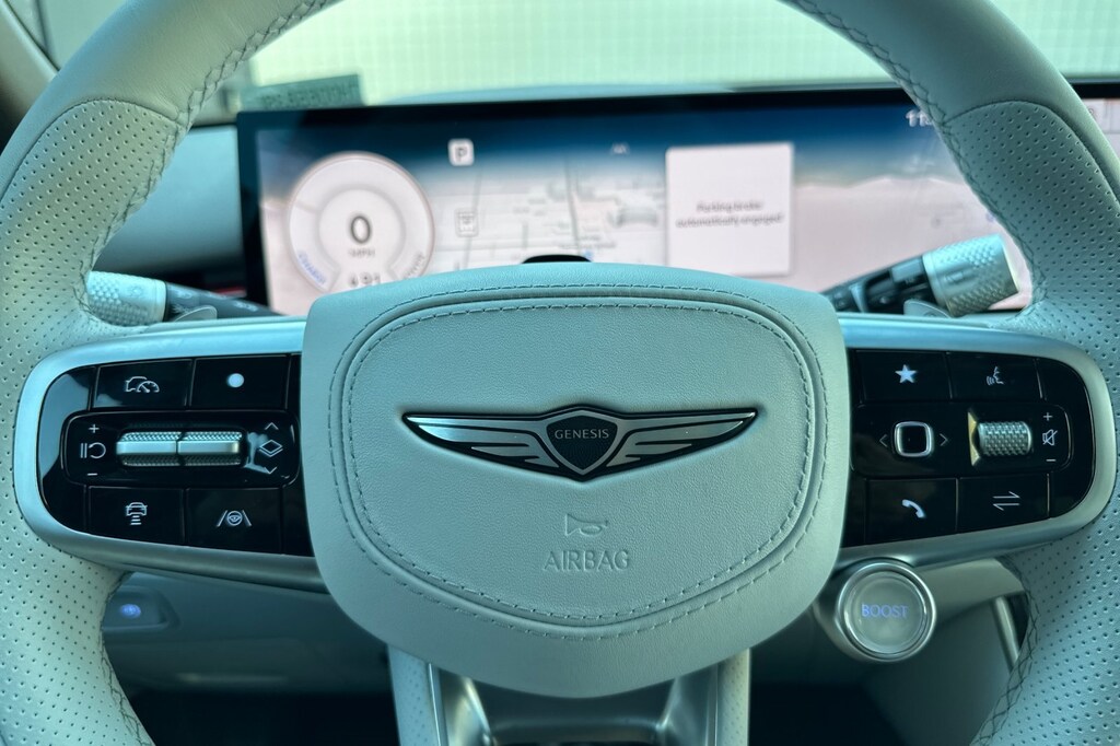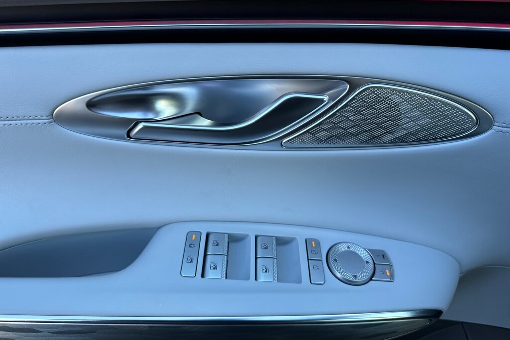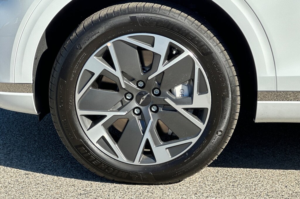 Option Group 01, 4-Wheel Disc Brakes, 8 Speakers, ABS brakes, Adaptive suspension, Air Conditioning, Alloy wheels, AM/FM radio: SiriusXM, Anti-whiplash front head restraints, Auto High-beam Headlights, Auto-dimming Rear-View mirror, Automatic temperature control, Brake assist, Bumpers: body-color, Cargo Net, Cargo Tray, Delay-off headlights, Driver door bin, Driver vanity mirror, Dual front impact airbags, Dual front side impact airbags, Electronic Stability Control, Emergency communication system: Genesis Connected Services, Exterior Parking Camera Rear, First Aid Kit, Four wheel independent suspension, Front anti-roll bar, Front Bucket Seats, Front Center Armrest, Front dual zone A/C, Front reading lights, Fully automatic headlights, Garage door transmitter: HomeLink, Heated door mirrors, Heated Front Seats, Heated front seats, Illuminated entry, Knee airbag, Leather Seating Surfaces, Leather steering wheel, Low tire pressure warning, Memory seat, Navigation System, Occupant sensing airbag, Outside temperature display, Overhead airbag, Overhead console, Panic alarm, Passenger door bin, Passenger vanity mirror, Power door mirrors, Power driver seat, Power Liftgate, Power moonroof, Power passenger seat, Power steering, Power windows, Radio: AM/FM/HD, Rain sensing wipers, Rear anti-roll bar, Rear reading lights, Rear seat center armrest, Rear window defroster, Rear window wiper, Remote keyless entry, Security system, Speed control, Speed-sensing steering, Speed-Sensitive Wipers, Split folding rear seat, Spoiler, Steering wheel memory, Steering wheel mounted audio controls, Telescoping steering wheel, Traction control, Trip computer, Turn signal indicator mirrors, Variably intermittent wipers, and Wheels: 19" x 8.0J Matte Dark Gray Alloy.
