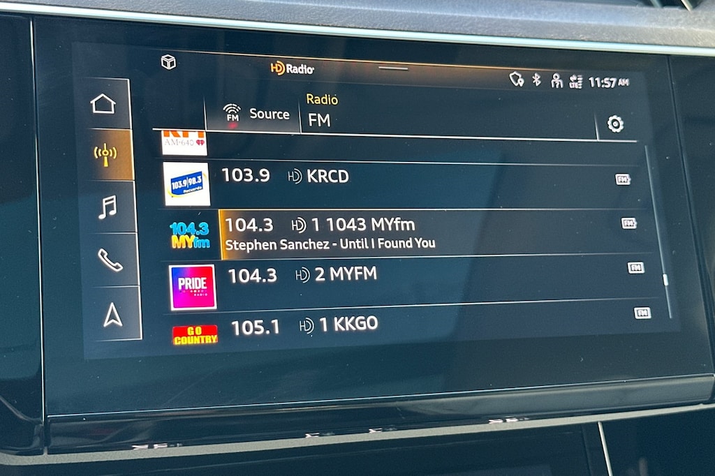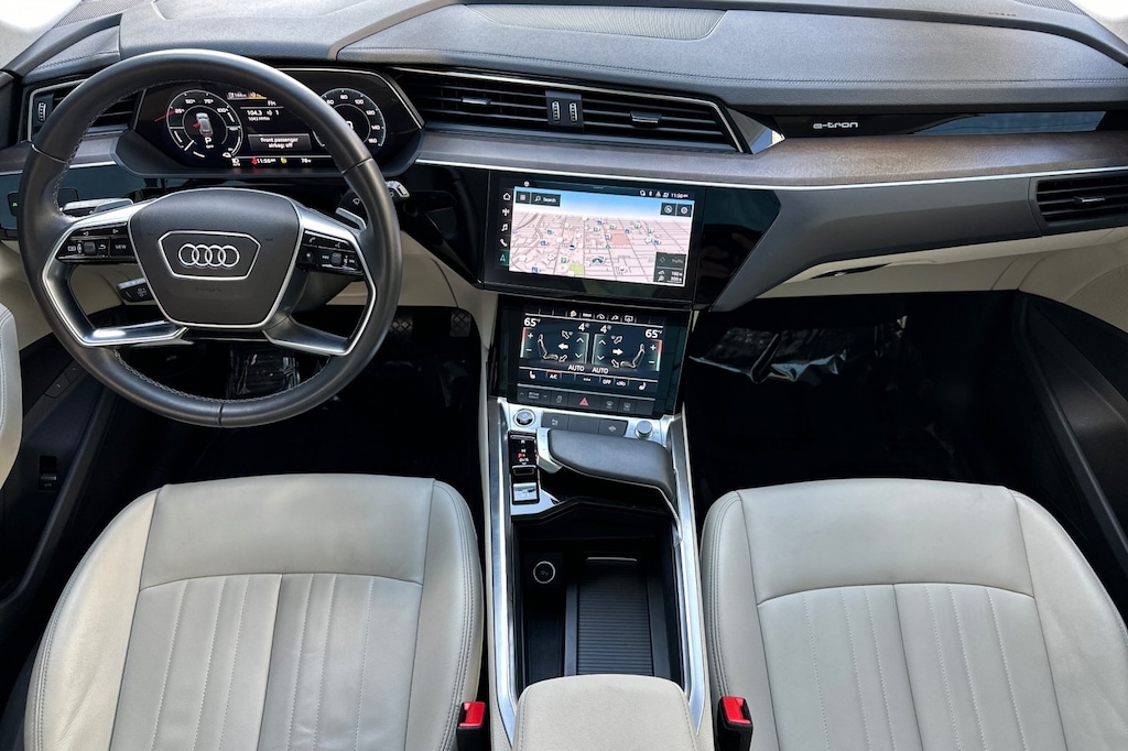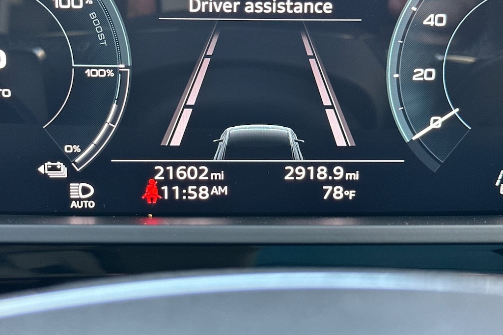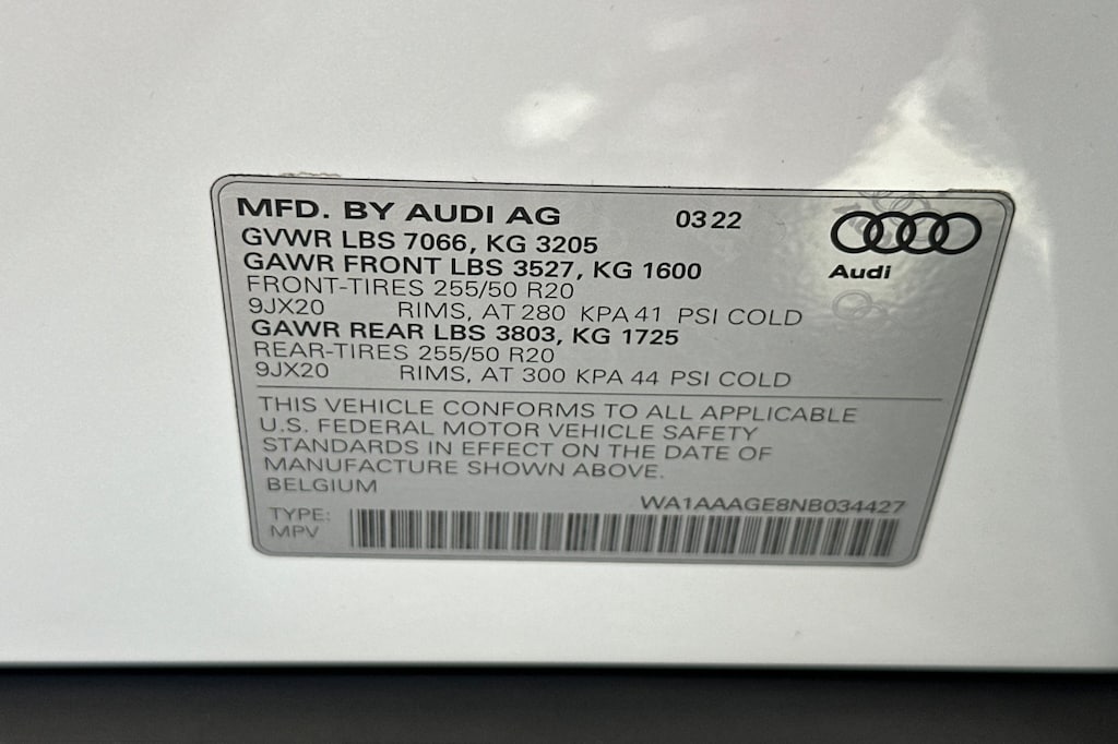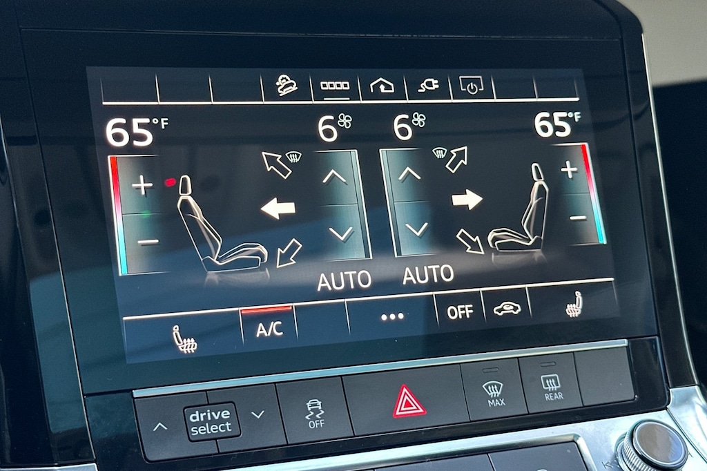 10 Speakers, 4-Wheel Disc Brakes, 9.08 Axle Ratio, ABS brakes, Adaptive suspension, Air Conditioning, Alloy wheels, Audi smartphone interface (Apple CarPlay/Android Auto), Auto High-beam Headlights, Auto-dimming door mirrors, Auto-dimming Rear-View mirror, Auto-leveling suspension, Automatic temperature control, Brake assist, Bumpers: body-color, Compass, Delay-off headlights, Driver door bin, Driver vanity mirror, Dual front impact airbags, Dual front side impact airbags, Electronic Stability Control, Emergency communication system: Audi connect CARE, PRIME & PLUS, Exterior Parking Camera Rear, Four wheel independent suspension, Front anti-roll bar, Front Bucket Seats, Front Center Armrest, Front dual zone A/C, Front fog lights, Front reading lights, Fully automatic headlights, Garage door transmitter: HomeLink, Heated 8-Way Power Front Seats, Heated door mirrors, Heated front seats, Heated steering wheel, Illuminated entry, Leather Seating Surfaces, Low tire pressure warning, Memory seat, Navigation system: Audi MMI Navigation plus with Touch Response, Occupant sensing airbag, Outside temperature display, Overhead airbag, Overhead console, Panic alarm, Passenger door bin, Passenger vanity mirror, Power door mirrors, Power driver seat, Power Liftgate, Power moonroof: Panoramic, Power passenger seat, Power steering, Power windows, Radio data system, Radio: Audi Sound System, Rear air conditioning, Rear anti-roll bar, Rear dual zone A/C, Rear fog lights, Rear reading lights, Rear seat center armrest, Rear window defroster, Rear window wiper, Remote keyless entry, Roof rack: rails only, Security system, Speed control, Speed-sensing steering, Split folding rear seat, Spoiler, Steering wheel memory, Steering wheel mounted audio controls, Telescoping steering wheel, Tilt steering wheel, Traction control, Trip computer, Turn signal indicator mirrors, Variably intermittent wipers, and Wheels: 20" 5-Arm-Dynamic Design Bi-Color Finish.