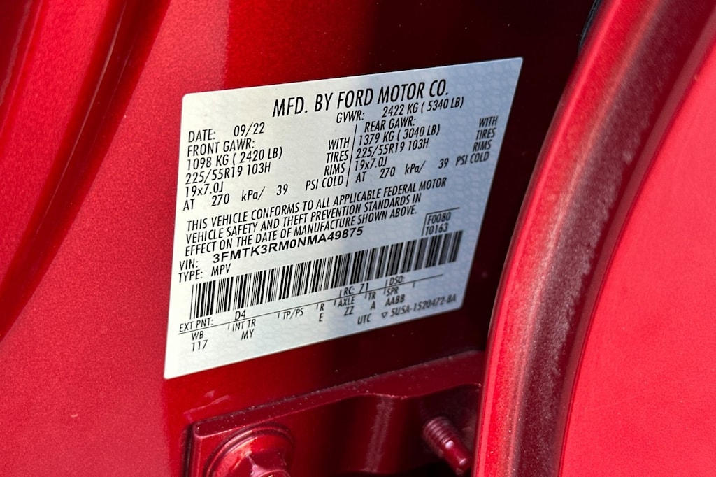 Active Park Assist Prep Kit, Apple CarPlay/Android Auto, Auto-dimming Rear-View mirror, Equipment Group 300A, Navigation system: Connected Navigation. Equipment Group 300A, Active Park Assist Prep Kit, Apple CarPlay/Android Auto, Auto-dimming Rear-View mirror, Navigation system: Connected Navigation, 10 Speakers, 4-Wheel Disc Brakes, ABS brakes, Air Conditioning, Alloy wheels, AM/FM radio: SiriusXM with 360L, AM/FM Stereo, Auto High-beam Headlights, Automatic temperature control, Axle Ratio: 9.05, Brake assist, Bumpers: body-color, Compass, Delay-off headlights, Driver door bin, Driver vanity mirror, Dual front impact airbags, Dual front side impact airbags, Electronic Stability Control, Emergency communication system: 911 Assist, Exterior Parking Camera Rear, Four wheel independent suspension, Front anti-roll bar, Front Bucket Seats, Front Center Armrest, Front dual zone A/C, Front License Plate Bracket, Front reading lights, Fully automatic headlights, Garage door transmitter, Heated door mirrors, Heated front seats, Heated Perforated ActiveX Bucket Seats, Heated steering wheel, Illuminated entry, Knee airbag, Low tire pressure warning, Memory seat, Occupant sensing airbag, Outside temperature display, Overhead airbag, Overhead console, Panic alarm, Passenger door bin, Passenger vanity mirror, Power door mirrors, Power driver seat, Power Liftgate, Power passenger seat, Power steering, Power windows, Radio data system, Rain sensing wipers, Rear anti-roll bar, Rear seat center armrest, Rear side impact airbag, Rear window defroster, Rear window wiper, Remote keyless entry, Security system, SiriusXM Radio w/360L, Speed control, Speed-sensing steering, Speed-Sensitive Wipers, Split folding rear seat, Spoiler, Steering wheel mounted audio controls, SYNC 4A w/Enhanced Voice Recognition, Telescoping steering wheel, Tilt steering wheel, Traction control, Trip computer, Turn signal indicator mirrors, Variably intermittent wipers, and Wheels: 19" Machined-Face Aluminum.