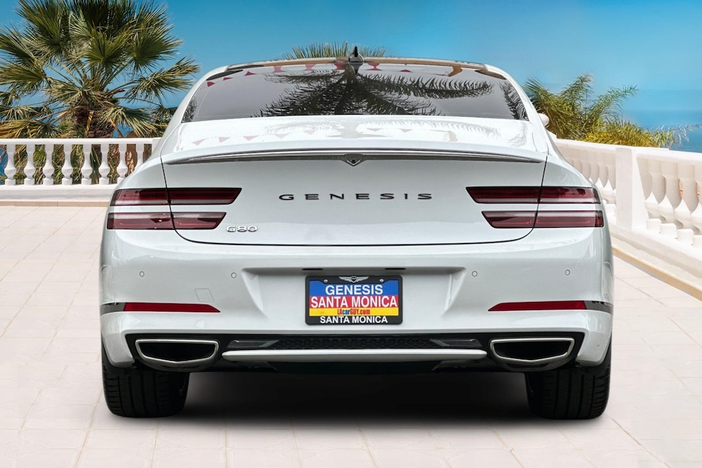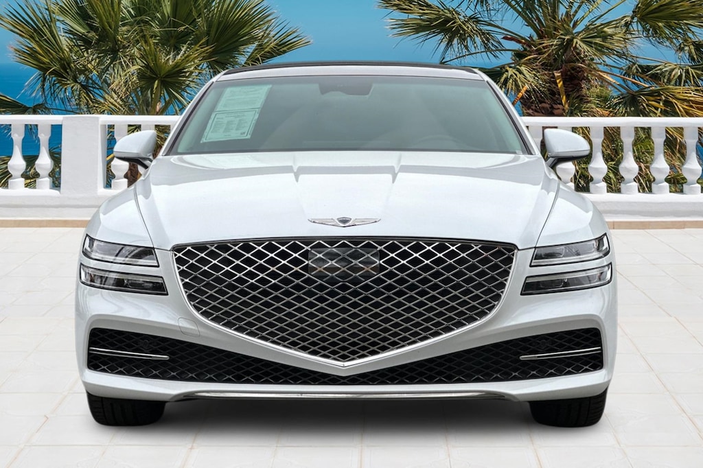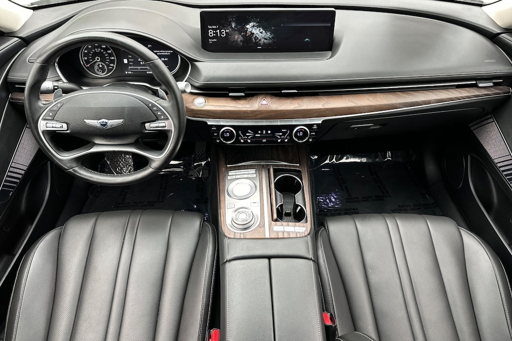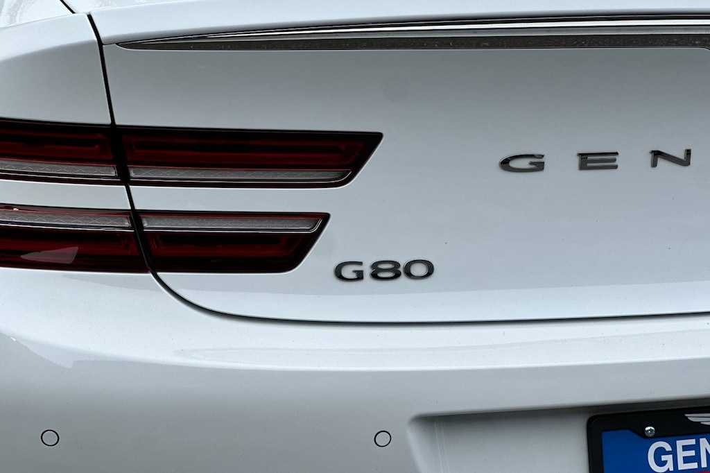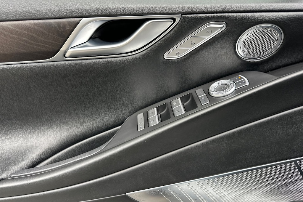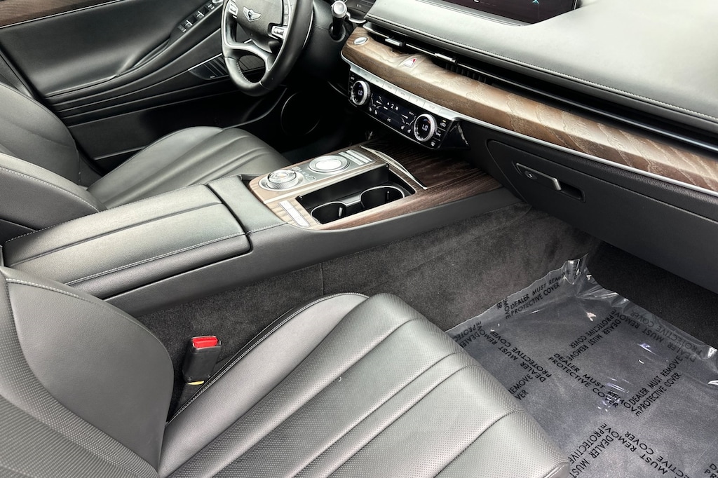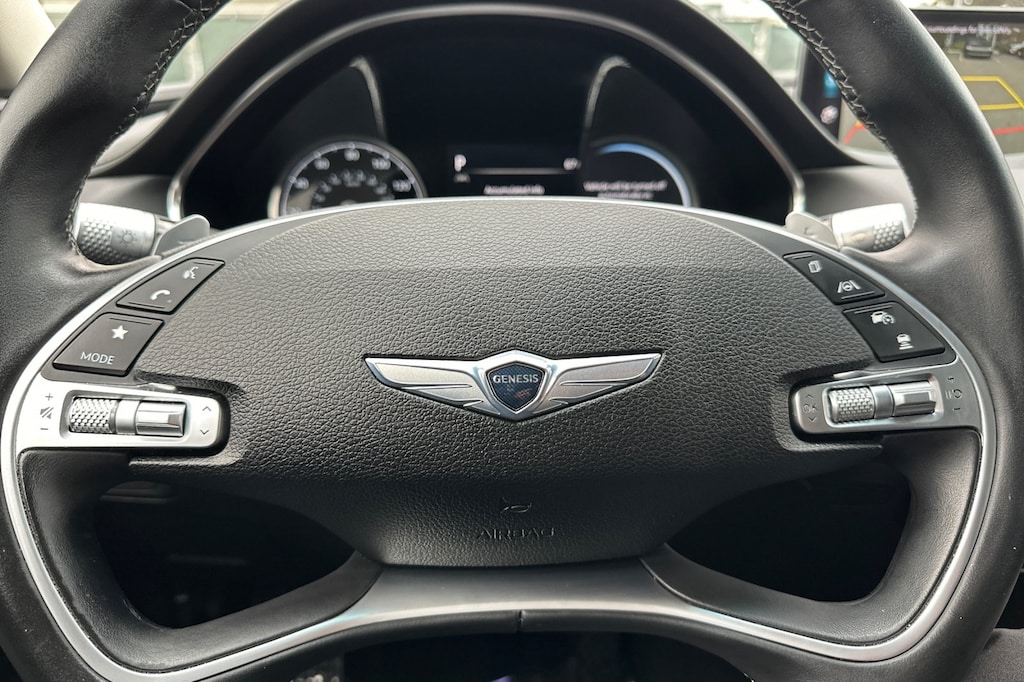 Advanced Package, Android Auto & Apple CarPlay, Exterior Parking Camera Rear, Heated Front Bucket Seats, Option Group 02, Panoramic Roof. Advanced Package (Option Group 02, Panoramic Roof, Matte Finish Wood Trim, Power Rear & Manual Rear Side Sunshades, Power Trunk, and Ventilated Front Seats), Android Auto & Apple CarPlay, Exterior Parking Camera Rear, Heated Front Bucket Seats, 12 Speakers, 4-Wheel Disc Brakes, ABS brakes, Air Conditioning, Alloy wheels, AM/FM radio: SiriusXM, Anti-whiplash front head restraints, Auto High-beam Headlights, Auto tilt-away steering wheel, Auto-dimming door mirrors, Auto-dimming Rear-View mirror, Automatic temperature control, Bumpers: body-color, Compass, Delay-off headlights, Driver door bin, Driver vanity mirror, Dual front impact airbags, Dual front side impact airbags, Electronic Stability Control, Emergency communication system: Genesis Connected Services, First Aid Kit, Forward Collision-Avoidance Assist, Four wheel independent suspension, Front anti-roll bar, Front Bucket Seats, Front Center Armrest, Front dual zone A/C, Front reading lights, Fully automatic headlights, Garage door transmitter: HomeLink, Heated door mirrors, Heated front seats, Highway Driving Assist, Illuminated entry, Knee airbag, Leather steering wheel, Low tire pressure warning, Memory seat, Mud Guards, Navigation System, Occupant sensing airbag, Outside temperature display, Overhead airbag, Overhead console, Panic alarm, Passenger door bin, Passenger vanity mirror, Power door mirrors, Power driver seat, Power passenger seat, Power steering, Power windows, Radio data system, Radio: AM/FM/HD/SiriusXM Audio System, Rain sensing wipers, Rear anti-roll bar, Rear reading lights, Rear seat center armrest, Rear side impact airbag, Rear window defroster, Remote keyless entry, Security system, Speed control, Speed-sensing steering, Speed-Sensitive Wipers, Steering wheel memory, Steering wheel mounted audio controls, Tachometer, Telescoping steering wheel, Tilt steering wheel, Traction control, Trip computer, Turn signal indicator mirrors, Variably intermittent wipers, and Wheels: 18"x8.0J Alloy.