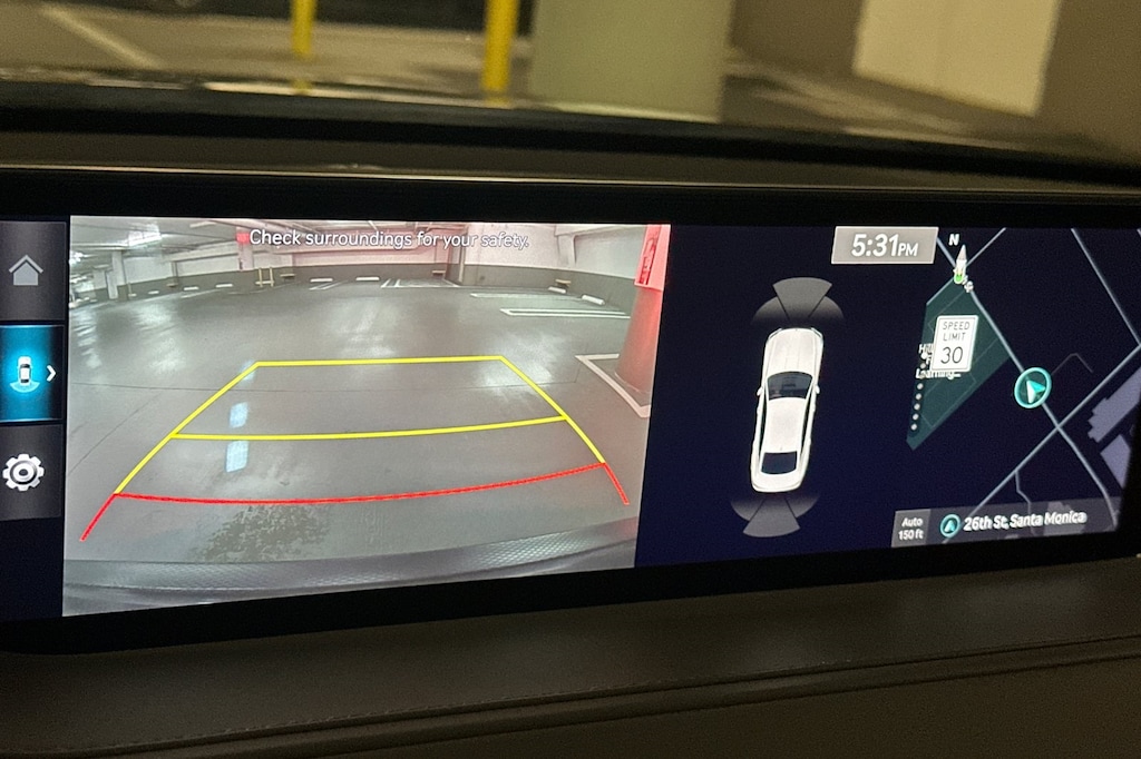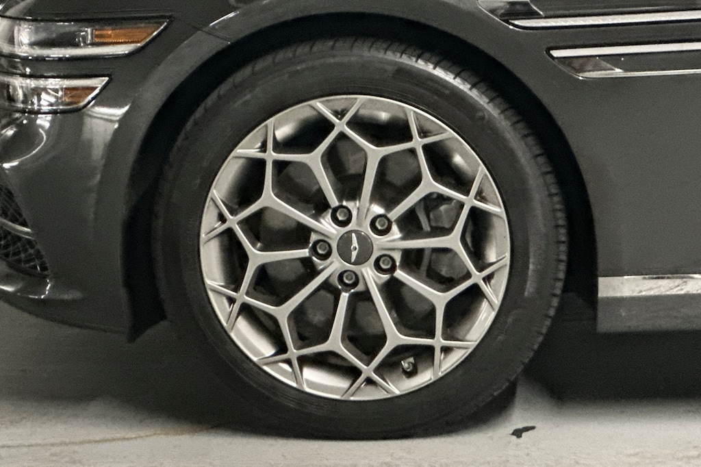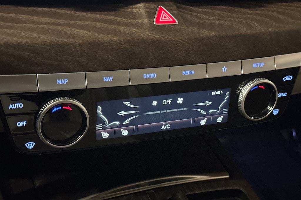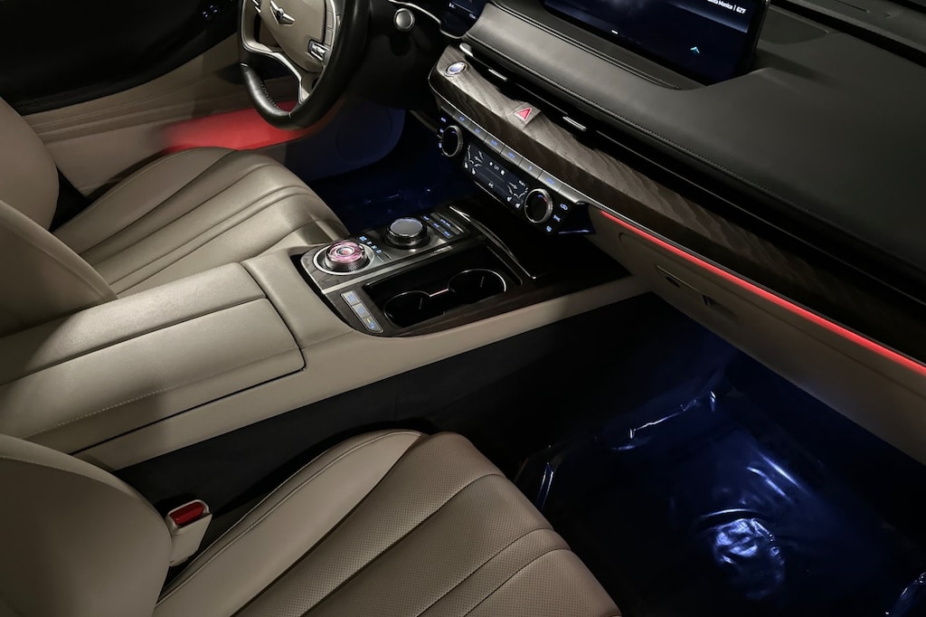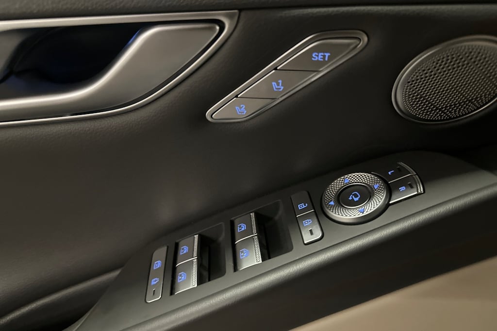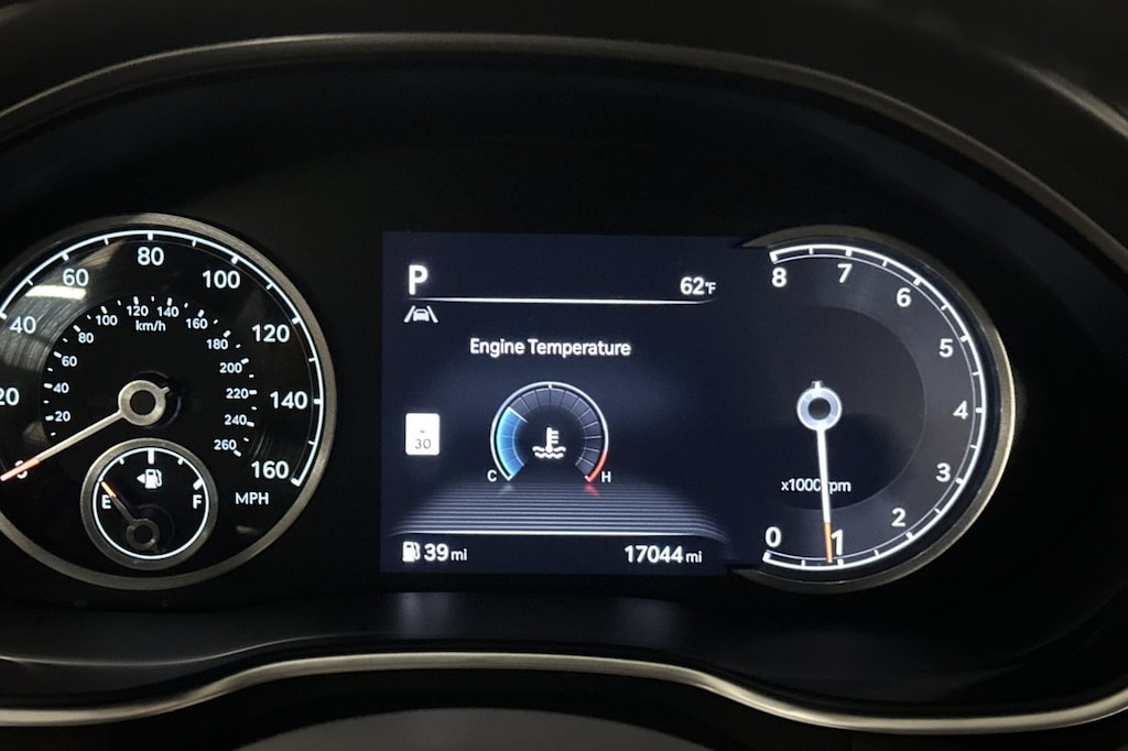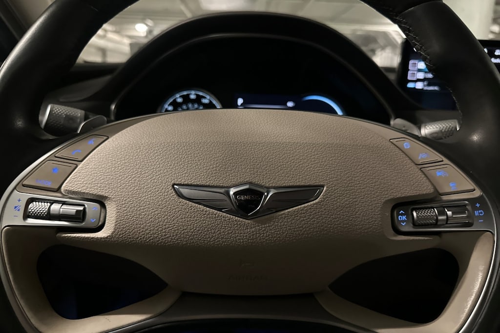 Advanced Package, 12 Speakers, 4-Wheel Disc Brakes, ABS brakes, Air Conditioning, Alloy wheels, AM/FM radio: SiriusXM, Android Auto & Apple CarPlay, Anti-whiplash front head restraints, Auto High-beam Headlights, Auto tilt-away steering wheel, Auto-dimming door mirrors, Auto-dimming Rear-View mirror, Automatic temperature control, Bumper Applique, Bumpers: body-color, Compass, Delay-off headlights, Driver door bin, Driver vanity mirror, Dual front impact airbags, Dual front side impact airbags, Electronic Stability Control, Emergency communication system: Genesis Connected Services, Exterior Parking Camera Rear, First Aid Kit, Four wheel independent suspension, Front anti-roll bar, Front Bucket Seats, Front Center Armrest, Front dual zone A/C, Front reading lights, Fully automatic headlights, Garage door transmitter: HomeLink, Heated door mirrors, Heated Front Bucket Seats, Heated front seats, Illuminated entry, Knee airbag, Leather steering wheel, Leatherette Seating Surfaces, Low tire pressure warning, Memory seat, Navigation System, Occupant sensing airbag, Outside temperature display, Overhead airbag, Overhead console, Panic alarm, Passenger door bin, Passenger vanity mirror, Power door mirrors, Power driver seat, Power passenger seat, Power steering, Power windows, Radio data system, Radio: AM/FM/HD/SiriusXM Audio System, Rain sensing wipers, Rear anti-roll bar, Rear reading lights, Rear seat center armrest, Rear side impact airbag, Rear window defroster, Remote keyless entry, Security system, Speed control, Speed-sensing steering, Speed-Sensitive Wipers, Steering wheel memory, Steering wheel mounted audio controls, Tachometer, Telescoping steering wheel, Tilt steering wheel, Traction control, Trip computer, Turn signal indicator mirrors, Variably intermittent wipers, and Wheels: 18"x8.0J Alloy.