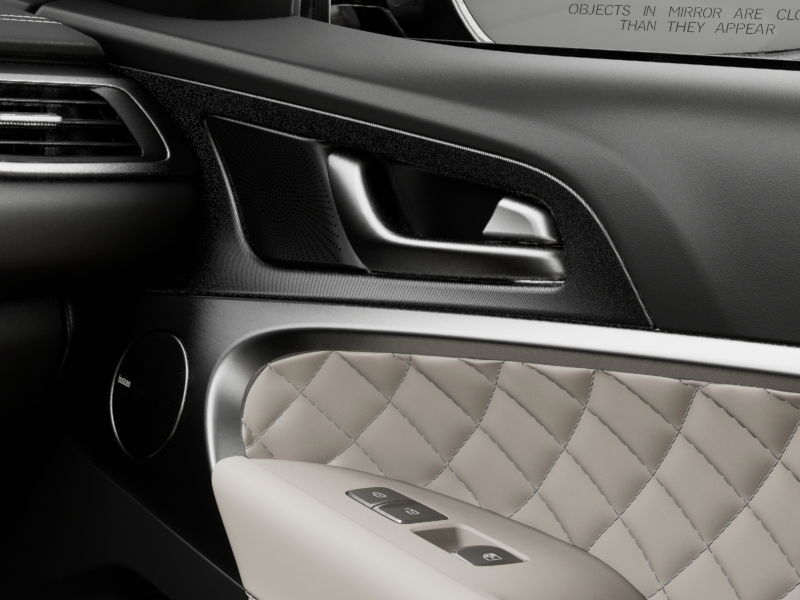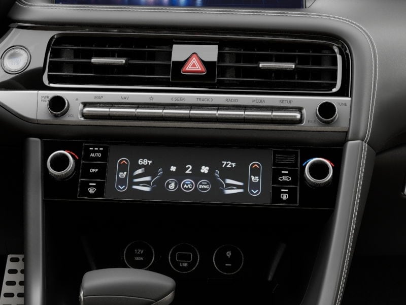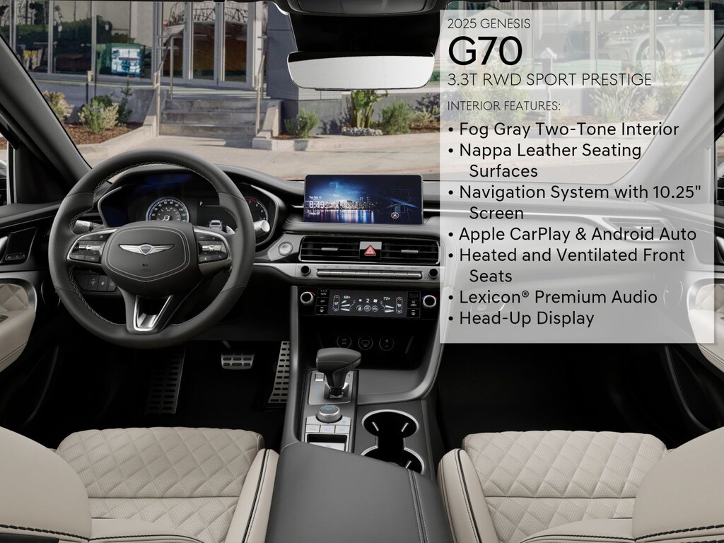 Sport Prestige Package, 15 Speakers, 4-Wheel Disc Brakes, ABS brakes, Air Conditioning, Alloy wheels, AM/FM radio: SiriusXM, Android Auto & Apple CarPlay, Anti-whiplash front head restraints, Auto High-beam Headlights, Auto-dimming door mirrors, Auto-dimming Rear-View mirror, Automatic temperature control, Brake assist, Bumpers: body-color, Delay-off headlights, Driver door bin, Driver vanity mirror, Dual front impact airbags, Dual front side impact airbags, Electronic Stability Control, Emergency communication system: Genesis Connected Services, Exterior Parking Camera Rear, First Aid Kit, Four wheel independent suspension, Front anti-roll bar, Front Bucket Seats, Front Center Armrest, Front dual zone A/C, Front reading lights, Fully automatic headlights, Garage door transmitter: HomeLink, Heated door mirrors, Heated front seats, Htd & Ventilated Multi-Adjustable Fr Bucket Seats, Illuminated entry, Knee airbag, Leather Seating Surfaces, Low tire pressure warning, Memory seat, Mudguards, Navigation System, Occupant sensing airbag, Outside temperature display, Overhead airbag, Overhead console, Panic alarm, Passenger door bin, Passenger vanity mirror, Power door mirrors, Power driver seat, Power moonroof, Power passenger seat, Power steering, Power windows, Radio: AM/FM/SiriusXM/HD Lexicon Prem Audio System, Rain sensing wipers, Rear anti-roll bar, Rear reading lights, Rear seat center armrest, Rear side impact airbag, Rear window defroster, Remote keyless entry, Reversible Cargo Tray, Security system, Speed control, Speed-sensing steering, Speed-Sensitive Wipers, Split folding rear seat, Steering wheel memory, Steering wheel mounted audio controls, Tachometer, Telescoping steering wheel, Traction control, Trip computer, Turn signal indicator mirrors, Variably intermittent wipers, Ventilated front seats, Wheel Locks, and Wheels: 19" x 8.0J Fr & 19" x 8.5J Rr Sport Alloy.