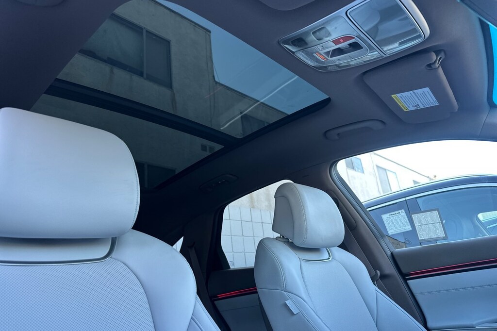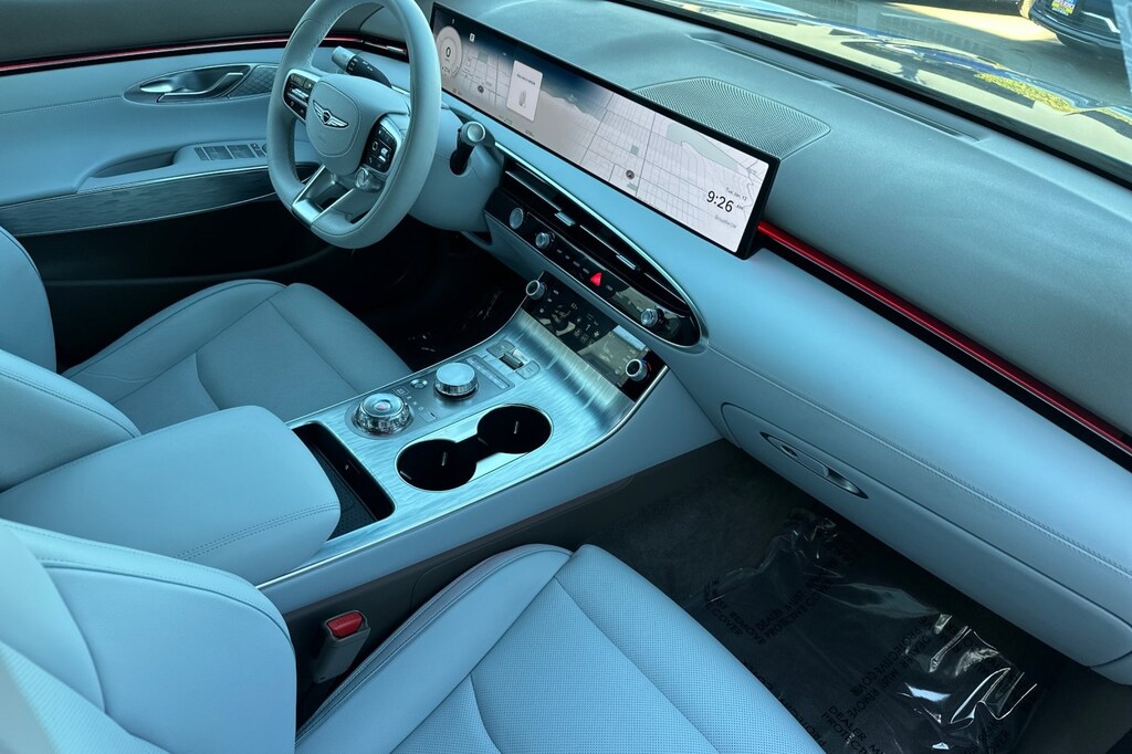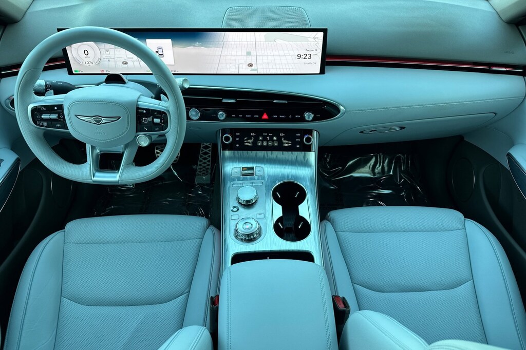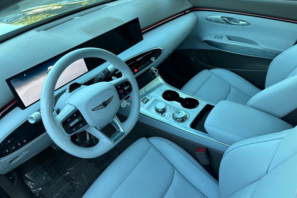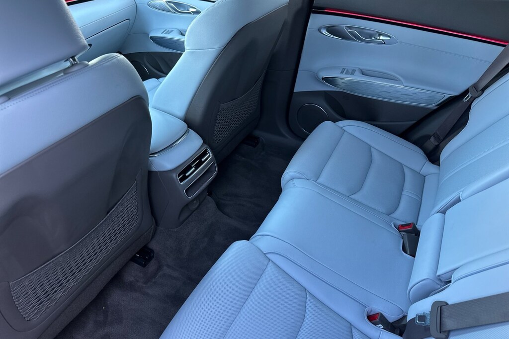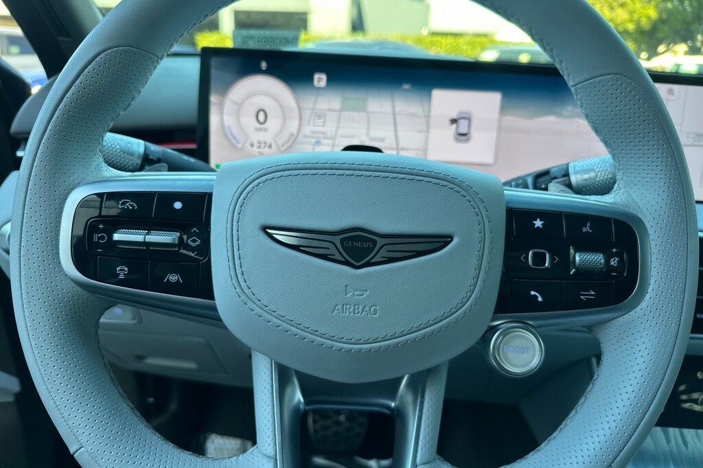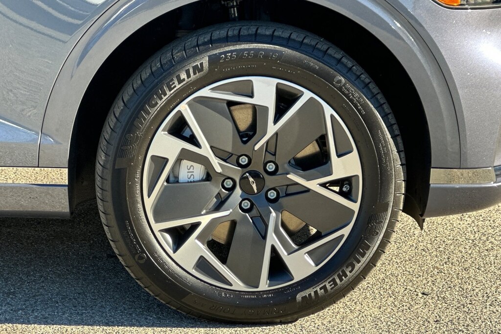 Option Group 01, 4-Wheel Disc Brakes, 8 Speakers, ABS brakes, Adaptive suspension, Air Conditioning, Alloy wheels, AM/FM radio: SiriusXM, Anti-whiplash front head restraints, Auto High-beam Headlights, Auto-dimming Rear-View mirror, Automatic temperature control, Brake assist, Bumpers: body-color, Cargo Net, Cargo Tray, Delay-off headlights, Driver door bin, Driver vanity mirror, Dual front impact airbags, Dual front side impact airbags, Electronic Stability Control, Emergency communication system: Genesis Connected Services, Exterior Parking Camera Rear, First Aid Kit, Four wheel independent suspension, Front anti-roll bar, Front Bucket Seats, Front Center Armrest, Front dual zone A/C, Front reading lights, Fully automatic headlights, Garage door transmitter: HomeLink, Heated door mirrors, Heated Front Seats, Heated front seats, Illuminated entry, Knee airbag, Leather Seating Surfaces, Leather steering wheel, Low tire pressure warning, Memory seat, Navigation System, Occupant sensing airbag, Outside temperature display, Overhead airbag, Overhead console, Panic alarm, Passenger door bin, Passenger vanity mirror, Power door mirrors, Power driver seat, Power Liftgate, Power moonroof, Power passenger seat, Power steering, Power windows, Radio: AM/FM/HD, Rain sensing wipers, Rear anti-roll bar, Rear reading lights, Rear seat center armrest, Rear window defroster, Rear window wiper, Remote keyless entry, Security system, Speed control, Speed-sensing steering, Speed-Sensitive Wipers, Split folding rear seat, Spoiler, Steering wheel memory, Steering wheel mounted audio controls, Telescoping steering wheel, Traction control, Trip computer, Turn signal indicator mirrors, Variably intermittent wipers, and Wheels: 19" x 8.0J Matte Dark Gray Alloy.