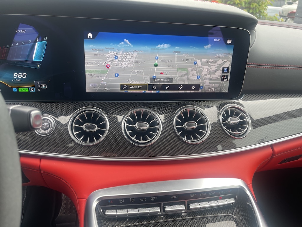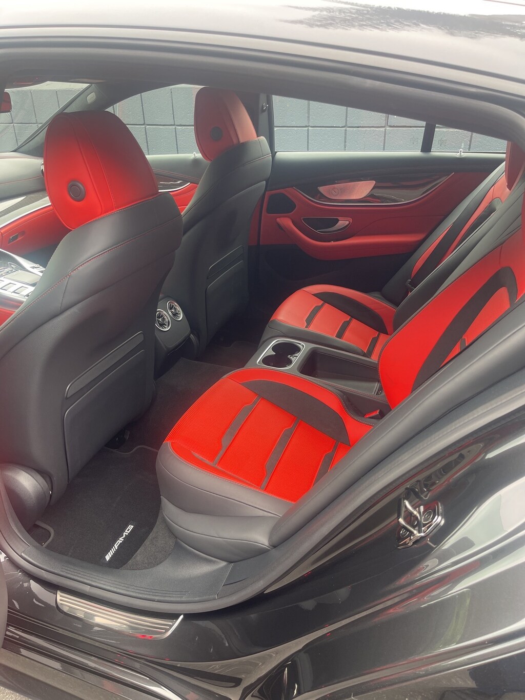 14 Speakers, 4-Wheel Disc Brakes, ABS brakes, Adaptive suspension, Air Conditioning, Alloy wheels, AM/FM radio: SiriusXM, Apple CarPlay®/Android Auto®, Auto High-beam Headlights, Auto tilt-away steering wheel, Auto-dimming door mirrors, Auto-dimming Rear-View mirror, Automatic temperature control, Brake assist, Bumpers: body-color, Burmester® Surround Sound System, Child-Seat-Sensing Airbag, Compass, Delay-off headlights, Driver door bin, Driver vanity mirror, Dual front impact airbags, Dual front side impact airbags, Electronic Stability Control, Emergency communication system, Exterior Parking Camera Rear, Four wheel independent suspension, Front anti-roll bar, Front Bucket Seats, Front Center Armrest, Front dual zone A/C, Front reading lights, Fully automatic headlights, Garage door transmitter, Head restraints memory, Heated door mirrors, Heated Front Seats, Heated front seats, Illuminated entry, Knee airbag, Leather Shift Knob, Low tire pressure warning, MB-Tex/Microfiber Upholstery, Memory seat, Navigation System, Occupant sensing airbag, Outside temperature display, Overhead airbag, Overhead console, Panic alarm, Passenger door bin, Passenger vanity mirror, Power adjustable front head restraints, Power door mirrors, Power driver seat, Power Front Bucket Seats, Power Liftgate, Power moonroof, Power passenger seat, Power steering, Power windows, Premium audio system: MBUX, Radio data system, Radio: MBUX Infotainment & Navigation System, Rain sensing wipers, Rear anti-roll bar, Rear reading lights, Rear window defroster, Remote keyless entry, Security system, Speed control, Speed-sensing steering, Speed-Sensitive Wipers, Spoiler, Sport steering wheel, Steering wheel memory, Steering wheel mounted audio controls, Tachometer, Telescoping steering wheel, Tilt steering wheel, Traction control, Trip computer, Turn signal indicator mirrors, Variably intermittent wipers, and Wheels: 9.5" x 19" Fr/11" x 19" Rr AMG® Multispoke.