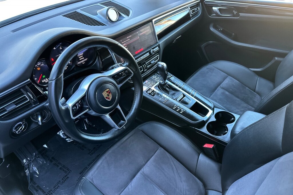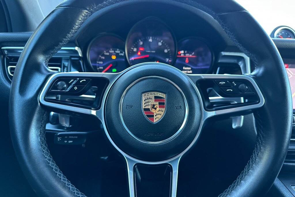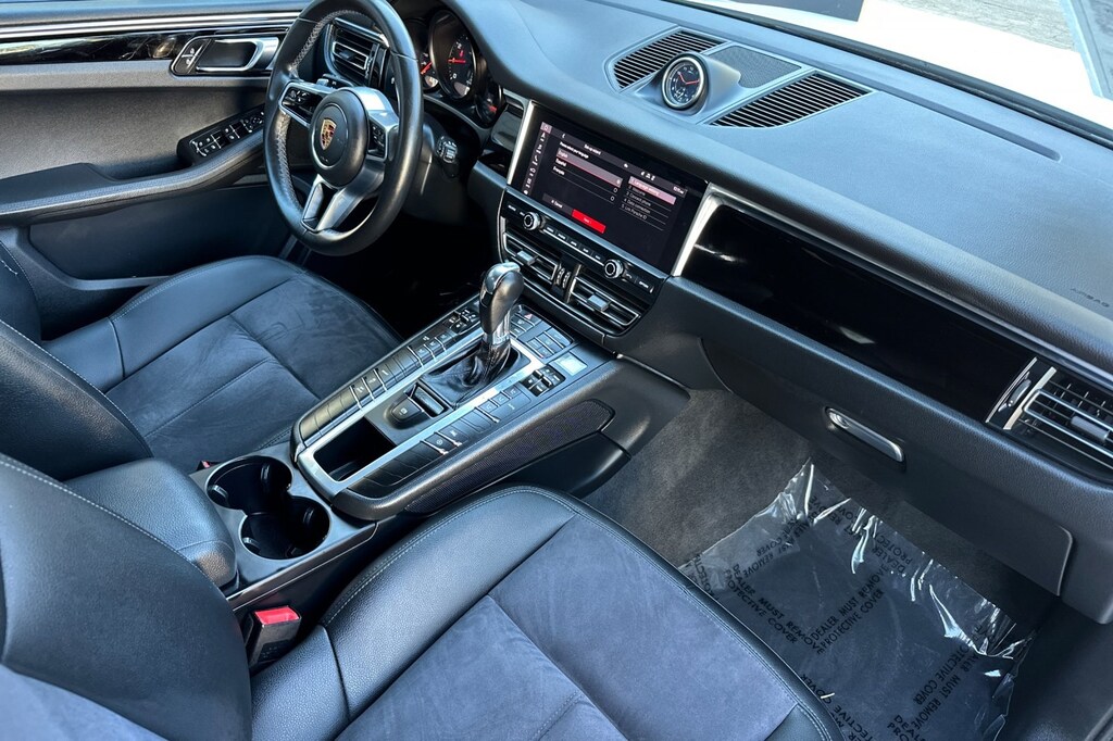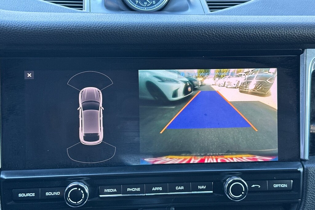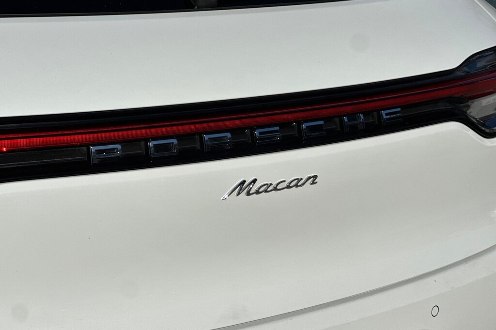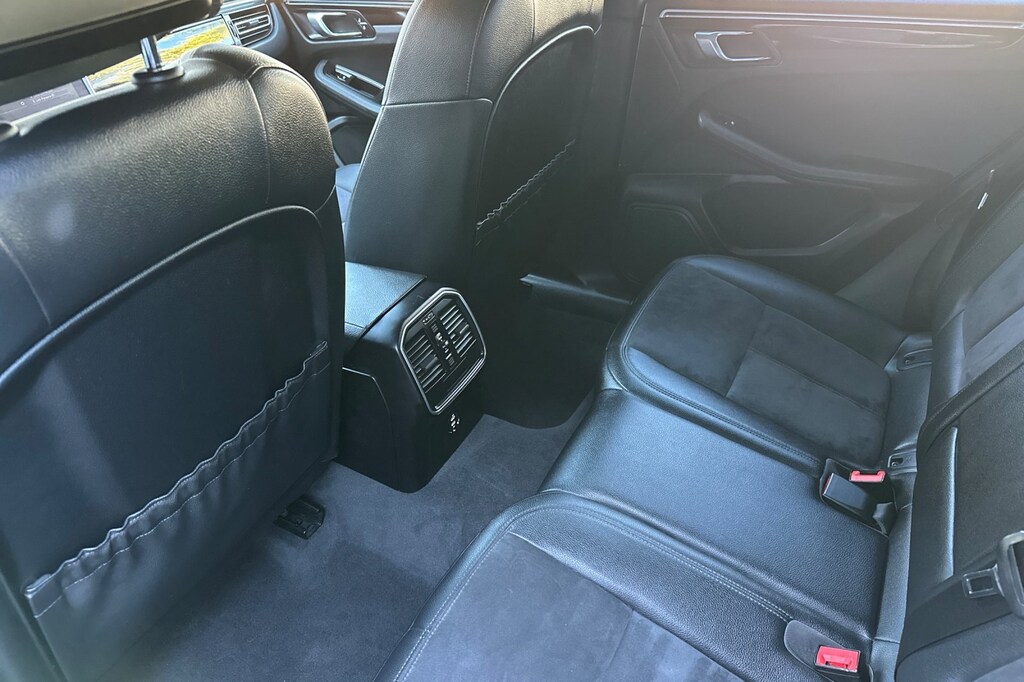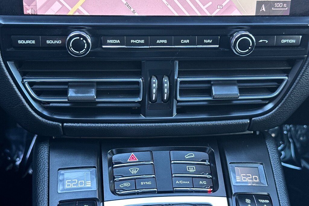 Navigation System, Power Liftgate, Spoiler. Navigation System, Power Liftgate, Spoiler, 10 Speakers, 4-Wheel Disc Brakes, 8-Way Power Seats, ABS brakes, Air Conditioning, Alloy wheels, AM/FM radio: SiriusXM, Automatic temperature control, Axle Ratio: 4.13, Brake assist, Bumpers: body-color, Delay-off headlights, Driver door bin, Driver vanity mirror, Dual front impact airbags, Dual front side impact airbags, Electronic Stability Control, Exterior Parking Camera Rear, Four wheel independent suspension, Front anti-roll bar, Front Bucket Seats, Front Center Armrest, Front dual zone A/C, Front fog lights, Front reading lights, Fully automatic headlights, Garage door transmitter: HomeLink, Heated door mirrors, Illuminated entry, Leather Shift Knob, Low tire pressure warning, Occupant sensing airbag, Outside temperature display, Overhead airbag, Overhead console, Panic alarm, Partial Leather Seat Trim w/Alcantara, Passenger door bin, Passenger vanity mirror, Porsche Communication Management, Power door mirrors, Power driver seat, Power passenger seat, Power steering, Power windows, Radio data system, Rain sensing wipers, Rear air conditioning, Rear anti-roll bar, Rear reading lights, Rear seat center armrest, Rear side impact airbag, Rear window defroster, Rear window wiper, Remote keyless entry, Security system, Speed control, Speed-sensing steering, Split folding rear seat, Sport steering wheel, Steering wheel mounted audio controls, Tachometer, Telescoping steering wheel, Tilt steering wheel, Traction control, Trip computer, Turn signal indicator mirrors, Variably intermittent wipers, and Wheels: 18" Macan.