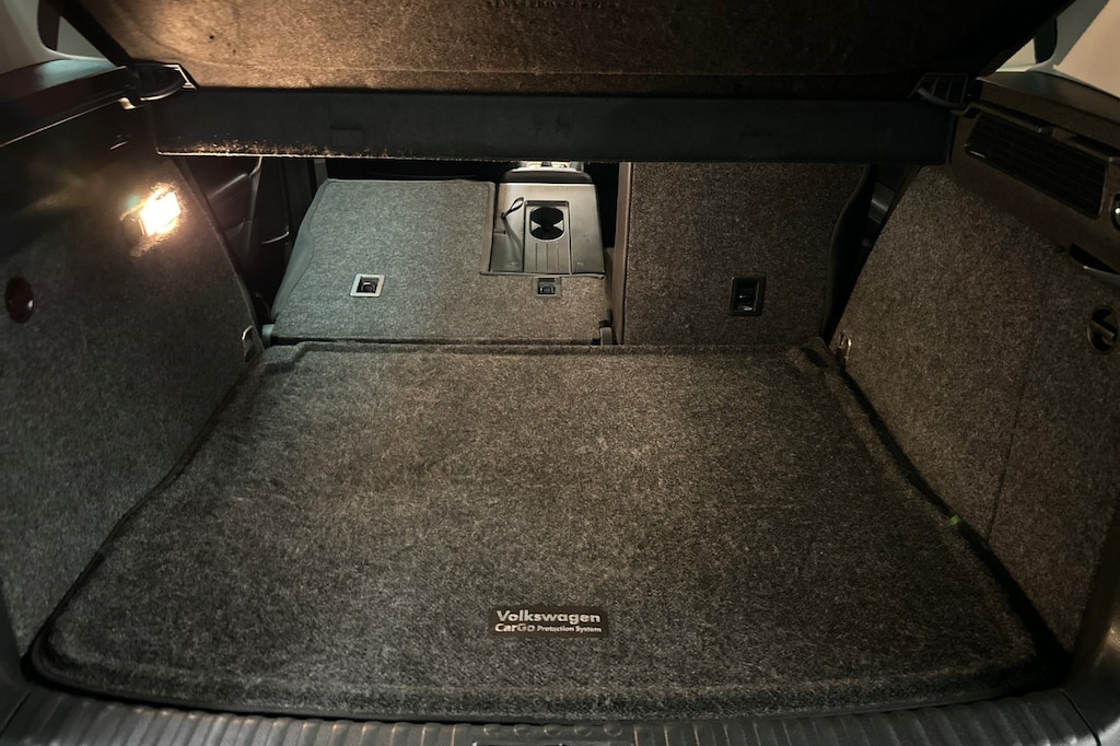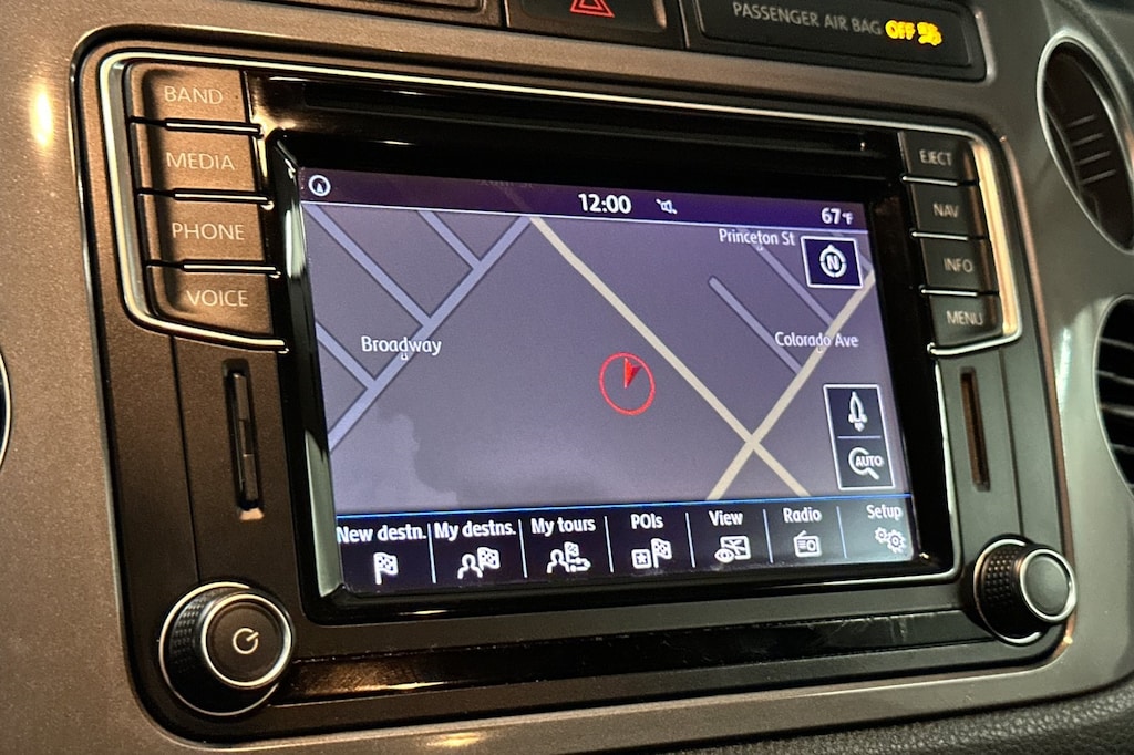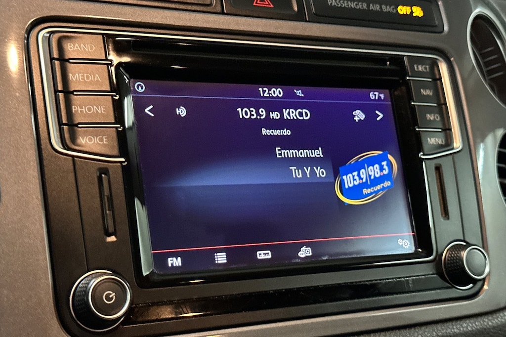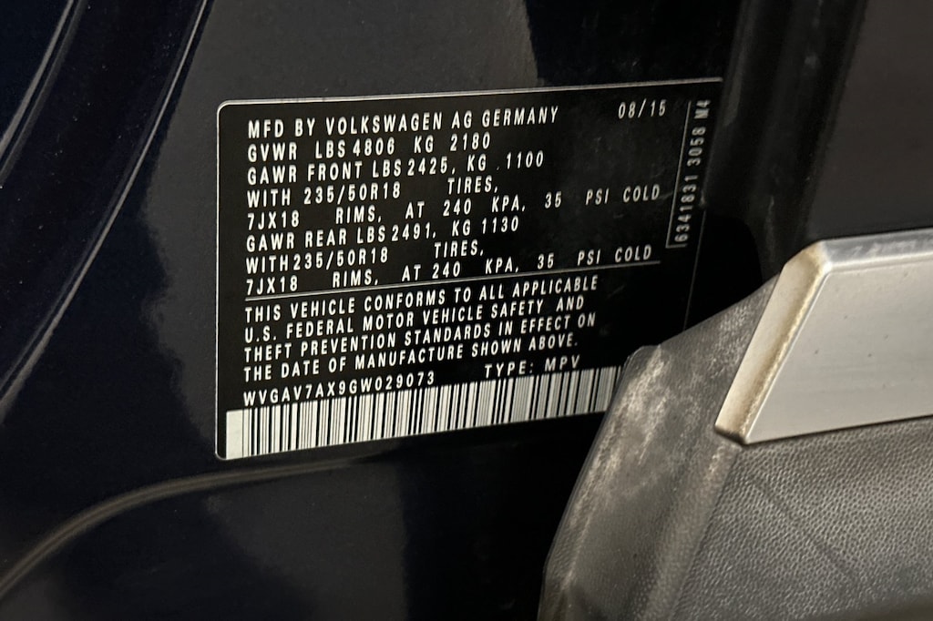 18" New York Alloy Wheels, 3.45 Axle Ratio, 4-Wheel Disc Brakes, 8 Speakers, ABS brakes, Air Conditioning, Alloy wheels, AM/FM radio: SiriusXM, Auto-dimming Rear-View mirror, Brake assist, Bumpers: body-color, CD player, Compass, Delay-off headlights, Driver door bin, Driver vanity mirror, Dual front impact airbags, Dual front side impact airbags, Electronic Stability Control, Emergency communication system: VW Car-Net, Exterior Parking Camera Rear, Four wheel independent suspension, Front anti-roll bar, Front Bucket Seats, Front Center Armrest w/Storage, Front fog lights, Front reading lights, Fully automatic headlights, Heated door mirrors, Heated Front Bucket Seats, Heated front seats, High-Intensity Discharge Headlights, Illuminated entry, Leather Shift Knob, Leather steering wheel, Low tire pressure warning, Navigation System, Occupant sensing airbag, Outside temperature display, Overhead airbag, Overhead console, Panic alarm, Passenger door bin, Passenger vanity mirror, Power door mirrors, Power driver seat, Power moonroof, Power passenger seat, Power steering, Power windows, Radio data system, Radio: Navigation AM/FM/HD/CD w/USB & Aux-In, Rain sensing wipers, Rear anti-roll bar, Rear reading lights, Rear seat center armrest, Rear window defroster, Rear window wiper, Remote keyless entry, Roadside Assistance Kit, Roof rack: rails only, Rubber Mat Kit, Security system, Security Wheel Locks (Set of 4), Speed control, Speed-sensing steering, Split folding rear seat, Spoiler, Steering wheel mounted audio controls, Tachometer, Telescoping steering wheel, Tilt steering wheel, Traction control, Trip computer, Turn signal indicator mirrors, V-Tex Leatherette Seating Surfaces, and Variably intermittent wipers.